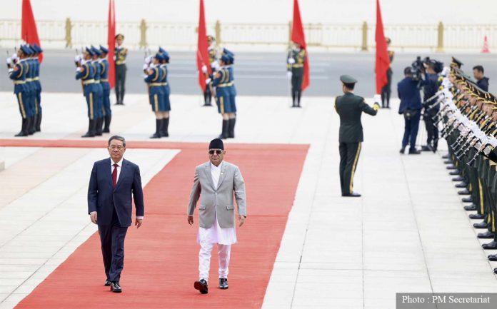 चीन भ्रमणमा रहेका प्रधानमन्त्री पुष्पकमल दाहाल प्रचण्ड र चिनियाँ समकक्षी ली छ्याङबीच भेटवार्ता भएको छ । दुई देशका प्रधानमन्त्रीबीच आज बिहान चीनको राजधानी बेइजिङमा भेटवार्ता भएको हो ।भेटमा बीआरआई सम्बन्धी सम्झौता कार्यान्वयन, व्यापारिक सन्धि पुनरावलोकनका साथै ऊर्जा, कृषि, सूचना प्रविधि लगायतका विषयमा छलफल भएको बताइएको छ ।छलफलमा नेपालको तर्फबाट परराष्ट्रमन्त्री एनपी साउद, भौतिक पूर्वाधार तथा यातायात मन्त्री प्रकाश ज्वाला, खानेपानी तथा सरसफाइ मन्त्री महिन्द्र राय यादव लगायत मन्त्रीहरु पनि सहभागी छन् । उक्त छलफलपछि केही सहमति पत्रमा दुवै देशका अधिकारीहरुबीच हस्ताक्षर गर्ने कार्यक्रम छ ।चीनको औपचारिक भ्रमणमा रहेका प्रधानमन्त्री प्रचण्डको सम्मानमा चीन सरकारको तर्फबाट चिनियाँ जनमुक्ति सेनाले सलामीसहित गार्ड अफ अनर प्रदान गरेको थियो । गार्ड अफ अनरपछि जारी छ ।चिनियाँ राष्ट्रपति सी जिनफिङसँग हाङजाउ सहरमा भएको भेटमा भएको कुराकानीका आधारमा सहयोग सम्बन्धी सहमति पत्रमा हस्ताक्षर गर्ने तयारी छ । संयुक्त राष्ट्रसंघको ७८ औं महासभामा भाग लिएर प्रधानमन्त्री प्रचण्ड उतैबाट चीनको औपचारिक भ्रमणका लागि हाङजाउ सहरमा पुगेका थिए ।समकक्षी ली छ्याङसँगको भेटअघि प्रधानमन्त्री प्रचण्ड र चीनको राष्ट्रिय जनकंग्रेसको स्थायी समिति अध्यक्ष झाओ लेजीसँग भेटवार्ता भएको थियो ।चीन बसाइको क्रममा प्रधानमन्त्री प्रचण्डले छोङछिङ्ग महानगरपालिकामा चीनले अपनाएको आधुनिक खेती प्रणालीबारे अवलोकन गर्ने र बेइजिङस्थित नेपाली राजदूतावासले आयोजना गर्ने चीन–नेपाल लगानी सम्मेलनलाई सम्बोधन गर्ने कार्यसूचीसमेत छ ।त्यसपछि प्रधानमन्त्री प्रचण्ड नेपालसँग सिमाना जोडिएको चीनको स्वशासित क्षेत्र तिब्बतको भ्रमणमा जानेछन् । प्रधानमन्त्री प्रचण्ड यही सेप्टेम्बर ३० मा नेपाल फर्कने कार्यक्रम छ ।