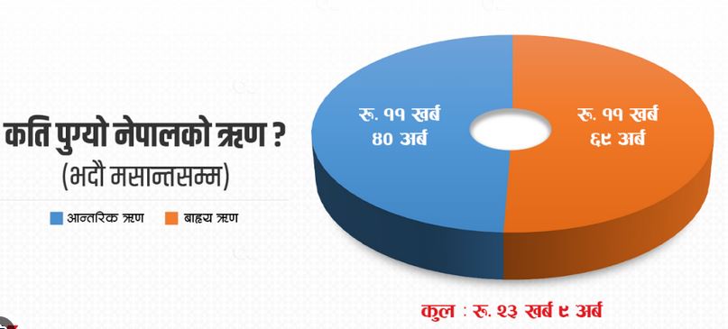 नेपालको सार्वजनिक ऋण २३ खर्ब माथि पुगेको छ । चालु आर्थिक वर्ष (आव)२०८०/८१ को पहिलो दुई महिनामा सरकारले ४९ अर्ब २३ करोड रुपैयाँ सार्वजनिक ऋण थपेको हो । यस अवधिमा सरकारले ३८ अर्ब ७१ करोड ऋण भने भुक्तानी गरेको छ ।सार्वजनिक ऋण व्यवस्थापन कार्यालयको तथ्यांकअनुसार असार मसान्तसम्म नेपालको ऋण २२ खर्ब ९९ अर्ब ३५ करोड २५ लाख रुपैयाँ रहेको थियो । यसमा साउन र भदौ महिनामा सरकारले कुल ४९ अर्ब २३ करो ३२ लाख रुपैयाँ ऋण थपेको छ । सोही अवधिमा ३८ अर्ब ७१ करोड ६१ लाख रुपैयाँ ऋण भुक्तानी गरेको छ ।नेपालको आन्तरिक ऋण ११ खर्ब ४० अर्ब ५३ करोड र बाह्य ऋण ११ खर्ब ६९ करोड ३३ करोड रुपैयाँ रहेको छ । भदौ मसान्तसम्म नेपालको कुल सार्वजनिक ऋणको आंकडा २३ खर्ब माथि पुगेको तथ्यांकमा उल्लेख छ ।भदौ मसान्तसम्मको सार्वजनिक ऋण प्रतिव्यक्ति दायित्वका हिसावले ७९ हजार २०१ रुपैयाँ पर्न जान्छ । नेपालको जनसंख्या २ करोड ९१ लाख ६४ हजार ५७८ मा भाग गर्दा सो रकम आएको हो ।