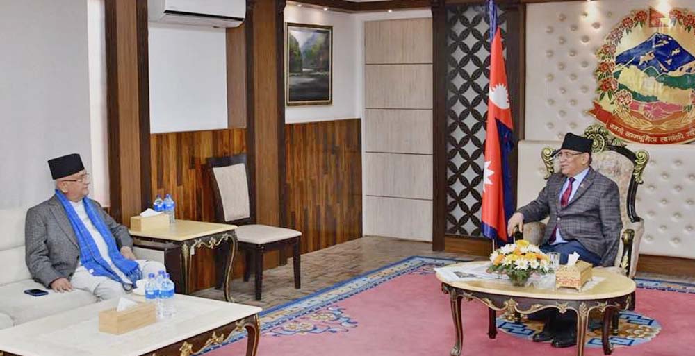 प्रधानमन्त्री पुष्पकमल दाहाल ‘प्रचण्ड’ र प्रमुख प्रतिपक्षी नेकपा (एमाले)का अध्यक्ष केपी शर्मा ओलीबीच भेटवार्ता भएको छ ।सिंहदरबारमा आज भएको भेटवार्तामा उहाँहरुबीच सङ्क्रमणकालीन न्यायसम्बन्धी विषयलाई टुङ्गोमा पुर्‍याउने तथा सदनमा दर्ता भएका विधेयकका सम्बन्धमा छलफल भएको प्रधानमन्त्री दाहालको सचिवालयले जनाएको छ ।बेपत्ता पारिएका व्यक्तिहरुको छानबिन, सत्य निरुपण तथा मेलमिलाप आयोग ऐन, २०७१ लाई संशोधन गर्न बनेको विधेयक, संवैधानिक परिषद् (काम, कर्तव्य, अधिकार र कार्यविधि) सम्बन्धी ऐन, २०६६ लाई संशोधन गर्न बनेको विधेयक, विद्यालय शिक्षा विधेयक, २०८० लगायत महत्वपूर्ण विधेयक सदनमा दर्ता भएका छन् । सरकारले संविधान कार्यान्वनसँग सम्बन्धित विधेयकलाई सदनबाट निष्कर्षमा पुर्‍याउने गरी काम गरिरहेको छ ।