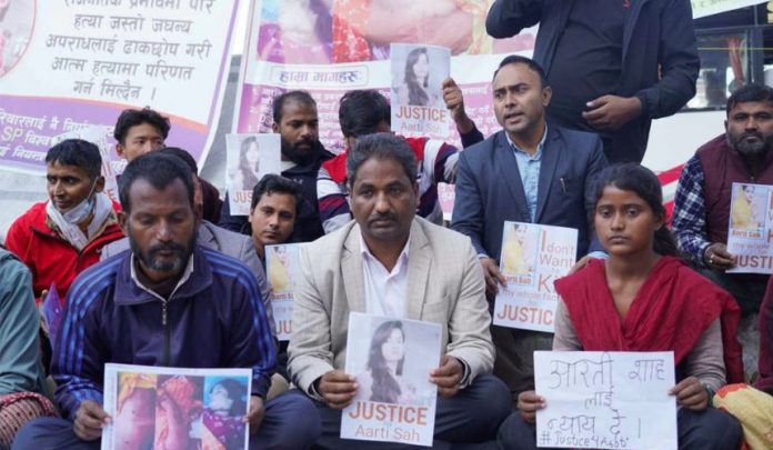 आरती साहलाई न्याय दिन माग गर्दै काठमाडौंको माइतीघरमा उनको माइती पक्षले धर्ना जारी राखेको छ । बुधबारको धर्नामा आम जनता पार्टीका अध्यक्ष प्रभु साहसमेत सहभागी भएका छन् ।जनकपुर उपमहानगरपालिका–९ थापा चोकका मोदीबाबु साहसँग विवाह गरेकी आरती गत जेठ ७ गते आफ्नै घरमा मृत अवस्थामा भेटिएकी थिइन् ।साहको दाइजोका कारण परिवारले हत्या गरेको माइती पक्षको दाबी छ । घटनाको छानबिन गरेर दोषीलाई कारबाही गर्नुपर्ने माग गर्दै साहको परिवार लामो समयदेखि धर्नामा छ ।गृह मन्त्रालयले साहका बुवा विनोदप्रसाद साहलाई पत्र पठाएर आधिकारिक प्रतिनिधि तोकेर वार्तामा आउन आग्रह गरेको थियो । तर सरकार र आरती पक्षबीच वार्ता हुन सकेको छैन ।