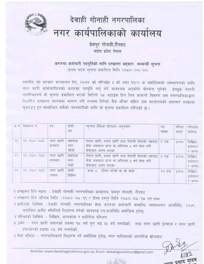 रौतहटको देवाही गोनाही नगरपालिकाले कार्तिक २३गते विभिन्न पदमा जागिर खुलाएको छ।विभिन्न पदमा नगरपालिकाले गरेको खुलाएको जागिर यस प्रकार रहेका छन।