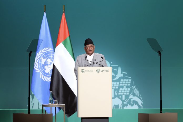 प्रधानमन्त्री पुष्पकमल दाहाल ‘प्रचण्ड’ले विश्वव्यापी उत्सर्जनमा नेपालको भूमिका शून्य प्रायः भए पनि जलवायु परिवर्तनको प्रत्यक्ष एवम् हानिकारक असर भोगिरहेको बताउनुभएको छ ।संयुक्त अरब इमिरेट्स (युएई)मा जारी जलवायु परिवर्तनसम्बन्धी संयुक्त राष्ट्रसङ्घीय सम्मेलन (कोप–२८)को कन्फ्रेन्स अफ पार्टिजलाई सम्बोधन गर्दै “हामीमाथि भएको डरलाग्दो अन्यायका कारण हाम्रा नागरिक बाढी पहिरो, डढेलो, हिमनदी विस्फोट, खडेरीजस्ता जलवायुजन्य सङ्कटबाट नराम्ररी प्रभावित भएका छन् ।”आफू तीन करोड नेपालीको सन्देश लिएर यस सम्मेलनमा सहभागी भएको उल्लेख गर्दै उहाँले विश्वव्यापी रुपमा बढ्दो तापक्रमले हाम्रा हिमाललाई यातना दिइएको बताउनुभयो । उहाँले भन्नुभयो, “तिनीहरुलाई पहिले बचाउनुहोस् ।”जलवायु परिवर्तनसम्बन्धी अन्तरसरकारी संयन्त्र (आइपिसिसी)ले दिएको प्रतिवेदनबाट आफूलाई सबैभन्दा बढी चिन्तित तुल्याएको उल्लेख गर्दै उहाँले जलवायु प्रेरित प्रकोपले हिमाली क्षेत्रमा कीर्तिमान तोडिरहेको बताउनुभयो ।प्रधानमन्त्रीले हाम्रा हिमनदीका एक तिहाइ हिस्सा गुमाइसकेको र वैज्ञानिकहरुले यस शताब्दीको अन्त्यसम्म थप एक तिहाइ हिस्सा गुमाउने अवस्था बताएको यथार्थता पेस गर्नुभयो । उहाँले यो हामी सबैका लागि जागरणको घण्टीसमेत भएको बताउनुभयो ।