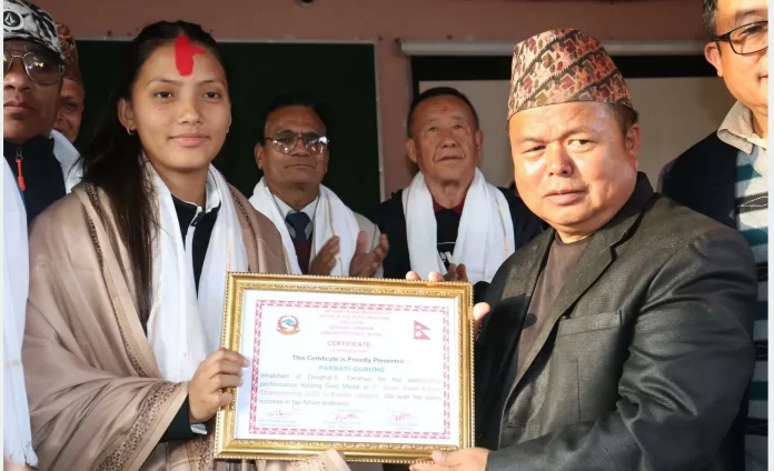 काठमाडौँमा सम्पन्न सातौँ दक्षिण एसियाली कराँते च्याम्पियनसीपमा स्वर्ण पदक विजेता तनहुँको देवघाट गाउँपालिका निवासी पार्वती गुरुङलाई गाउँपालिकाले नगदसहित सम्मान गरेको छ ।उक्त प्रतियोगितामा स्वर्ण पदक विजेता देवघाट गाउँपालिका–५ गैडाढुङ्गा निवासी गुरुङलाई गाउँपालिकाले शुक्रबार नगद रु २५ हजारसहित सम्मान गरेको हो । गाउँपालिकाका अध्यक्ष तिलबहादुर थापाले गुरुङलाई रु २५ हजार नगद र प्रमाणपत्र प्रदान गर्नुभयो ।कराँते प्रतियोगितामा स्वर्ण पदक जितेर नेपाल तथा देवघाट गाउँपालिकाको नाम राख्न सफल भएकाले प्रोत्साहनस्वरुप सम्मान गरिएको गाउँपालिकाका अध्यक्ष थापाले बताउनुभयो ।उहाँले खेलकुदमार्फत पालिकाको नाम राख्न सफल हुनुभएको छ । खेलाडीलाई प्रोत्साहन गर्नका लागि नगदसहित सम्मान गरेका हौँ ।सम्मानित भएपछि गुरुङले यसले आफूलाई प्रेरणा मिलेको बताउनुभयो । गुरुङले ४५ केजीमुनिको समूहमा बङ्गलादेशकी अर्पा सलिहालाई हराउँदै स्वर्ण पदक जित्नुभएको थियो ।