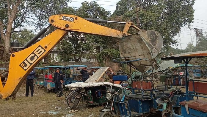 नेपालगञ्ज उपमहानगरपालिकाले नियन्त्रणमा लिएका अवैध रुपमा सञ्चालित ई–रिक्सा नष्ट गर्न सुरु गरेको छ । लामो समयदेखि ई–रिक्सा व्यवस्थापनमा लागेको उपमहानगरपालिकाले आवश्यक कागजात र वैधता पुष्टि गर्न नसकेका ई–रिक्सा नष्ट गर्न थालेको हो । गत मङ्सिर १९ गतेदेखि अवैध रुपमा सञ्चालित ई–रिक्सा नियन्त्रण अभियान थालेको उपमहानगरपालिकाले मङ्गलवार पाँच ई–रिक्सा नष्ट गरेको छ । आवश्यक कागजात नभएका ती ई–रिक्सा प्राविधिक जाँच गरी स्काभेटरले तोडफोड गरी नष्ट गरिएको हो । नष्ट गरिएका ई–रिक्सामा भे १ स ५४९८, भे १ स ८७५१, भे १ स ४८, भे १ स १५३१ र गाविस ०२ नम्बरका रहेका नगर प्रहरी प्रमुख सूर्यबहादुर बोगटीले बताउनुभयो । यातायात कार्यालय बाँकेका मेकानिकल सुपरभाइजर सुशील शर्माले ई–रिक्सा धनी तथा चालककै रहोवरमा कागजात अद्यावधिक भए÷नभएका, चेसिज नम्बर मिले÷नमिलेको वा भए/नभएको प्राविधिक जाँच गर्नुभएको थियो । उपमहानगरपालिकाले ई–रिक्सा नियन्त्रण गर्नुअघि पटक–पटक प्रक्रिया पु¥याउन आग्रह गरेको थियो । नियन्त्रणमा लिइसकेपछि पनि १५ दिने सूचना जारी गरेर ई–रिक्साका कागजपत्र अद्यावधिक गर्न समय दिइएको थियो । नगर प्रमुख प्रशान्त विष्टले नगरमा अवैध रुपमा सञ्चालित ई–रिक्सा पूर्णरूपमा सञ्चालनमा प्रतिबन्ध लगाउने अभियानमा उपमहानगरपालिका दृढ भएर लागेको बताउनुभयो । “हामीले पटक–पटक भनेको हौँ, अद्यावधिक गर्न समय पनि दिएका थियौँ, नियन्त्रणमा लिइएका धेरै ई–रिक्साले आवश्यक कागजात अद्यावधिक गरेपछि हामीले छाडेका छौँ, अवैध सञ्चालित ई–रिक्सा हामीले नष्ट गर्न सुरु गरेका छौँ”, नगर प्रमुख विष्टले भन्नुभयो, “अब हामी निरन्तर अगाडी बढ्छौँ, नीति नियम र कानुन भन्दा बाहिर गएर चल्ने छुट कसैलाई छैन ।” उपमहानगरपालिकाले हालसम्म छ सय २३ ई–रिक्सा नियन्त्रण लिएको छ । तीमध्ये आवश्यक कागजात र प्रक्रिया पु¥याएपछि पाँच सय ३८ ई–रिक्सा फिर्ता भएका छन् । अझै पनि ८५ ई–रिक्सा नियन्त्रणमै छन् । ती ई–रिक्सामाथि पनि छानविन भइरहेको नगर प्रहरी प्रमुख बोगटीले बताउनुभयो ।