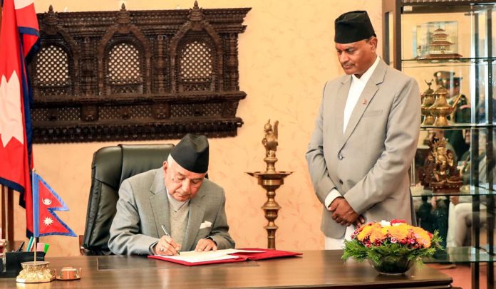 राष्ट्रपति रामचन्द्र पौडेलले आज अनुगमन तथा मूल्याङ्कन व्यवस्था गर्न बनेको विधेयक प्रमाणीकरण गर्नुभएको छ । सङ्घीय संसद्को दुवै सदनको बैठकबाट पारित भएको उक्त विधेयक राष्ट्रपतिले आज प्रमाणीकरण गर्नुभएको राष्ट्रपति कार्यालयले जनाएको छ । “सङ्घीय संसद्को दुवै सदनबाट पारित भई प्रमाणीकरणको लागि पेस हुन आएको नेपालको संविधानको धारा १२३ को उपधारा (२) बमोजिम राष्ट्रपतिले उक्त विधेयक प्रमाणीकरण गर्नुभएको छ”, राष्ट्रपतिको कार्यालयका प्रवक्ता शैलजा रेग्मी भट्टराईद्वारा जारी विज्ञप्तिमा भनिएको छ ।