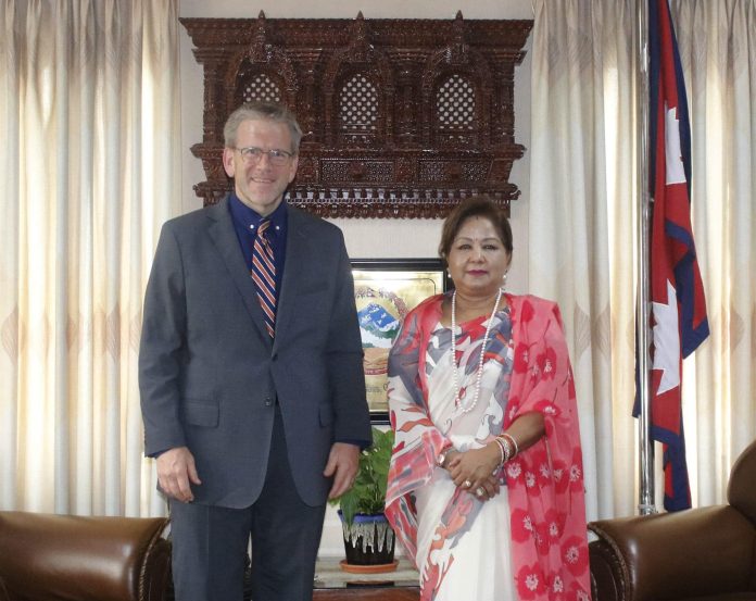 परराष्ट्रमन्त्री डा आरजु राणा देउवासँग नेपालका लागि अमेरिकी राजदूत डिन आर थम्पसनले आज शिष्टाचार भेट गर्नुभएको छ । सिंहदरबारस्थित परराष्ट्र मन्त्रालयमा भएको भेटका क्रममा उहाँहरूबीच नेपाल-अमेरिका सम्बन्धका विविध पक्षहरूका साथै द्विपक्षीय हितका बारेमा छलफल भएको थियो । भेटमा पारस्परिक लाभका विविध पक्ष, विकास तथा साझेदारीका विषयमासमेत छलफल भएको परराष्ट्र मन्त्रालयले जनाएको छ । —