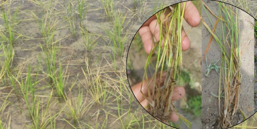 धान रोपेको एक महिना भएको छैन । समयमै वर्षा भएकाले यस वर्ष यहाँका किसानले समयमै धान रोप्न पाए । धान हरियो भएर गाँज लाग्ने बेला फेद कुहिन थालेको छ । फेद कुहिने र गाँज मर्ने समस्या देखापरेपछि किसान चिन्तित बनेका छन् । बागलुङ नगरपालिकको पैयुँपाटा, अमलाचौर, नारायणस्थान, सिम, कालीमाटीका खेतमा रोपेको धान दुई साता नपुग्दै मर्न थालेको हो । धानको फेद र डाँठ कुहिएर पहेँलो हुँदै मर्न थालेको किसान लालप्रसाद शर्माले बताउनुभयो । “धान गोड्ने समय हुँदै थियो, ढुसीजन्य रोग फैलिएर धानको फेद कुहिने र पात मर्ने समस्या देखिन थालेको छ”, शर्माले भन्नुभयो । हिउँदभरि खानपुग्ने अन्न उब्जाउन दुःख गरेर रोपेको धानका गावा खाली हुँदै गएका छन् । अनुकूल मौसम परेकाले समयमै धान रोप्न पाएपछि किसान हर्षित बनेका थिए । उत्पादन बढ्नेमा ढुक्क किसान एकाएक रोगको प्रकोप देखिन थालेपछि अहिले निराश बनेका छन् । “यस वर्ष समयमै वर्षात् हुँदा रोपाइँ सकेर उम्किएका थियौँ, बागलुङ–१३ पैँयुपाटाका किसान मुक्तिराम शर्माले भन्नुभयो, “अहिले धान उत्पादन पनि बढ्ने भो भनेर निकै आशावादी थियौँ, रोपेको दुई साता नपुग्दै फेद कुहिने समस्याले सबै धान मर्न थालेपछि सोचेजस्तो धान उत्पादन हुने भएन ।” रोग नियन्त्रणको उपाय खोजी भइरहेको उहाँले बताउनुभयो । उहाँले अधिकांशको पानीमा राखिएको बीउमा यो समस्या देखिएको बताउनुभयो । शर्माको झण्डै पाँच रोपनी खेतमा यो समस्या देखिएको छ । धानमा समस्या देखिएपछि नगरपालिकाले कृषि प्राविधिकसहितको टोली अनुसन्धानका लागि पठाएको छ । नगरपालिकाले तत्काल ढुसीजन्य रोग नियन्त्रणका लागि केही विषादी किसानलाई उपलब्ध गराएको बागलुङ–१३ का वडाध्यक्ष एवं आर्थिक विकास समितिका संयोजक नारायण शर्मा पौडेलले जानकारी दिनुभयो । पौडेलका अनुसार नगरपालिका र कृषि ज्ञान केन्द्रका प्राविधिकको स्थलगत अनुगमनपश्चात् रोग नियन्त्रणका लागि गर्न सकिने प्रयासको थालनी गरिएको छ । नगरभित्र झण्डै दुई सय रोपनी क्षेत्रफलको खेतमा यो समस्या देखिएको नगरपालिकाका कृषि शाखा प्रमुख सुवास सापकोटा बताउनुहुन्छ । उहाँले यसको रोकथामका लागि किसानलाई ‘बेबिस्टिन’ नामक विषादी उपलब्ध गराइएको र खेतमा विषादी राख्ने काम भएको बताउनुभयो । “धानको फेद कुहिने समस्या नगरक्षेत्रका विभिन्न वडामा देखिएको छ”, सापकोटाले भन्नुभयो, “विशेषगरी स्थानीय जातका धानबाली, एक्ले, गुडुरा, खुमलटार र गौरीयालगायत धानमा यो समस्या बढी देखिएको छ ।” उहाँले रोग नियन्त्रणका लागि किसानलाई खेतमा पानी सुकाएर औषधि प्रयोग गर्ने र एक सातामा एक दिनमात्र पानी लगाइ अन्य दिन सुक्खा राखेमा समस्याको समाधान हुने सापकोटाले बताउनुभयो । समयमा रोकथाम हुन नसकेमा प्र