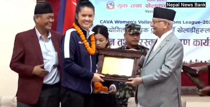 काठमाडौं । सरकारले काभा महिला भलिबल नेसन्स लिनमा उपविजेता बन्दै पदक जित्न सफल नेपाली राष्ट्रिय महिला भलिबल टोली, प्रशिक्षकहरु, व्यवस्थापक र फिजियोथेरापिस्टलाई नगद पुरस्कारसहित सम्मान गरेको छ ।