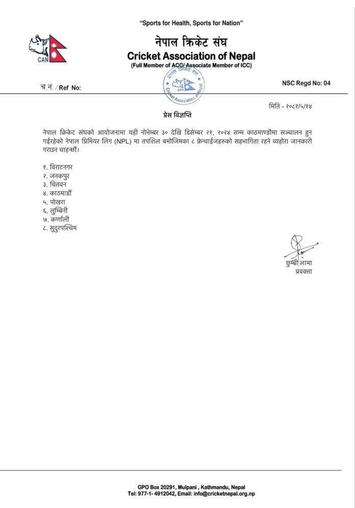 नेपाल क्रिकेट संघ (क्यान)ले नेपाल प्रिमियर लिग (एनपीएल) क्रिकेटको पहिलो संस्करणमा सहभागि हुने आठ फ्रेन्चाइज टोलीको नाम सार्वजनिक गरेको छ ।नेपाल क्रिकेट संघ (क्यान)ले शनिबार एक विज्ञप्ति जारी गर्दै मंसिर १५ देखि पुस ६ सम्म काठमाडौंमा हुने भनिएको प्रतियोगितामा सहभागी हुने टोलीको निश्चित गर्दै नामावली सार्वजनिक गरिएको छ ।एनपिएलमा प्रतिस्पर्धा गर्ने टोलीहरुमा विराटनगर, जनकपुर, चितवन, काठमाडौं, पोखरा, लुम्बिनी, कर्णाली र सुदूरपश्चिम रहेका छन् ।क्यानले केही दिनअघि एनपीएल आयोजना मिति र लोगो सार्वजनिक गरे पनि सहभागी टोली नाम र संख्या टुंगो लगाएको थिए ।