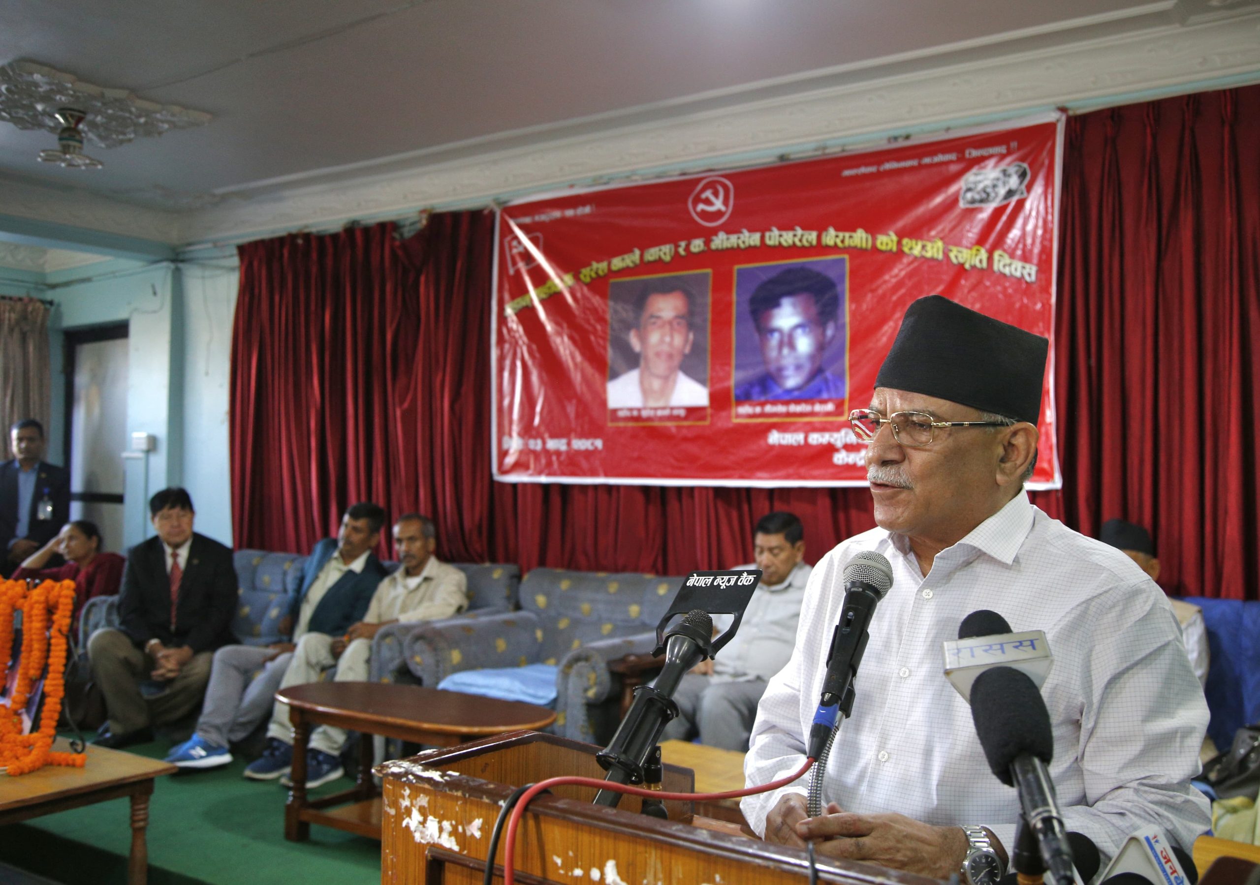 आइतबार पार्टी कार्यालय पेरिसडाँडामा आयोजित सहिदद्वय सुरेश वाग्ले ‘बासु’ र भीमसेन पोख्रेल ‘वैरागी’को २५औं स्मृति दिवसलाई सम्बोधन गर्दै अध्यक्ष दाहालले जनताको बलिदान र अधिकारविरुद्ध भइरहेको प्रतिक्रान्तिका प्रयासका विरुद्ध संघर्ष गर्नुपर्ने स्थिति सिर्जना भएको बताएका हुन् ।