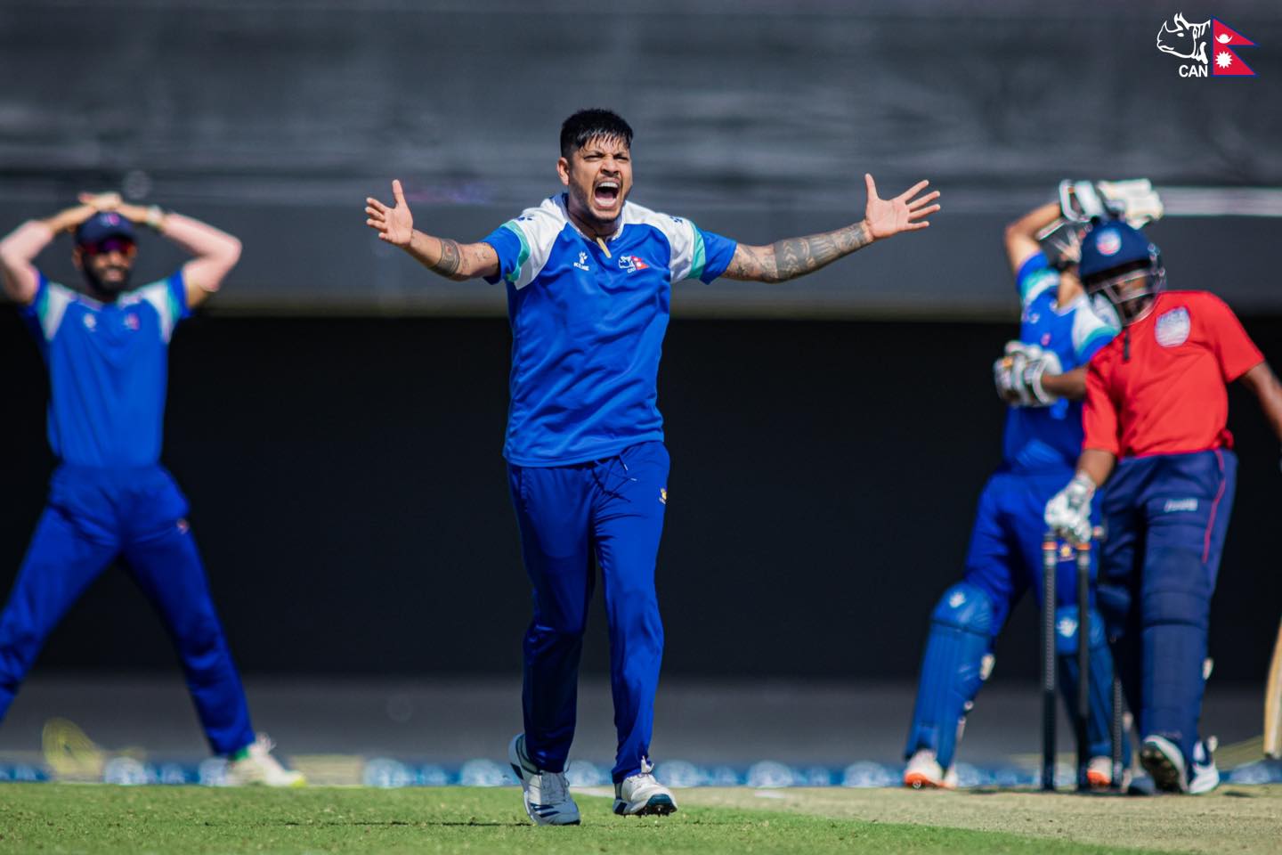 नेपालका कुशल मल्लले १८, देव खनालले १२, भीम सार्कीले १० रन बनाए । यस्तै अनिलकुमार साह शून्य रनमा आउट हुँदा अन्य खेलाडीले दोहोरो अङ्कमा रन बनाएन सकेनन् । सबैभन्दा धेरै १८ रन बनाए । अमेरिका ुएु का आरिन नदकर्नीले ४ विकेट लिए ।