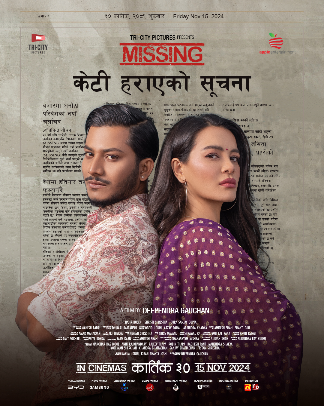 नेपाली चलचित्र ‘मिसिङः केटी हराएको सूचना’ को दोस्रो पोस्टर सार्वजनिक भएको छ। पोस्टरमा चलचित्रका मुख्य पात्रहरू नाजिर हुसेन र सृष्टि श्रेष्ठलाई केही गम्भीर भावमा देखाइएको छ ।