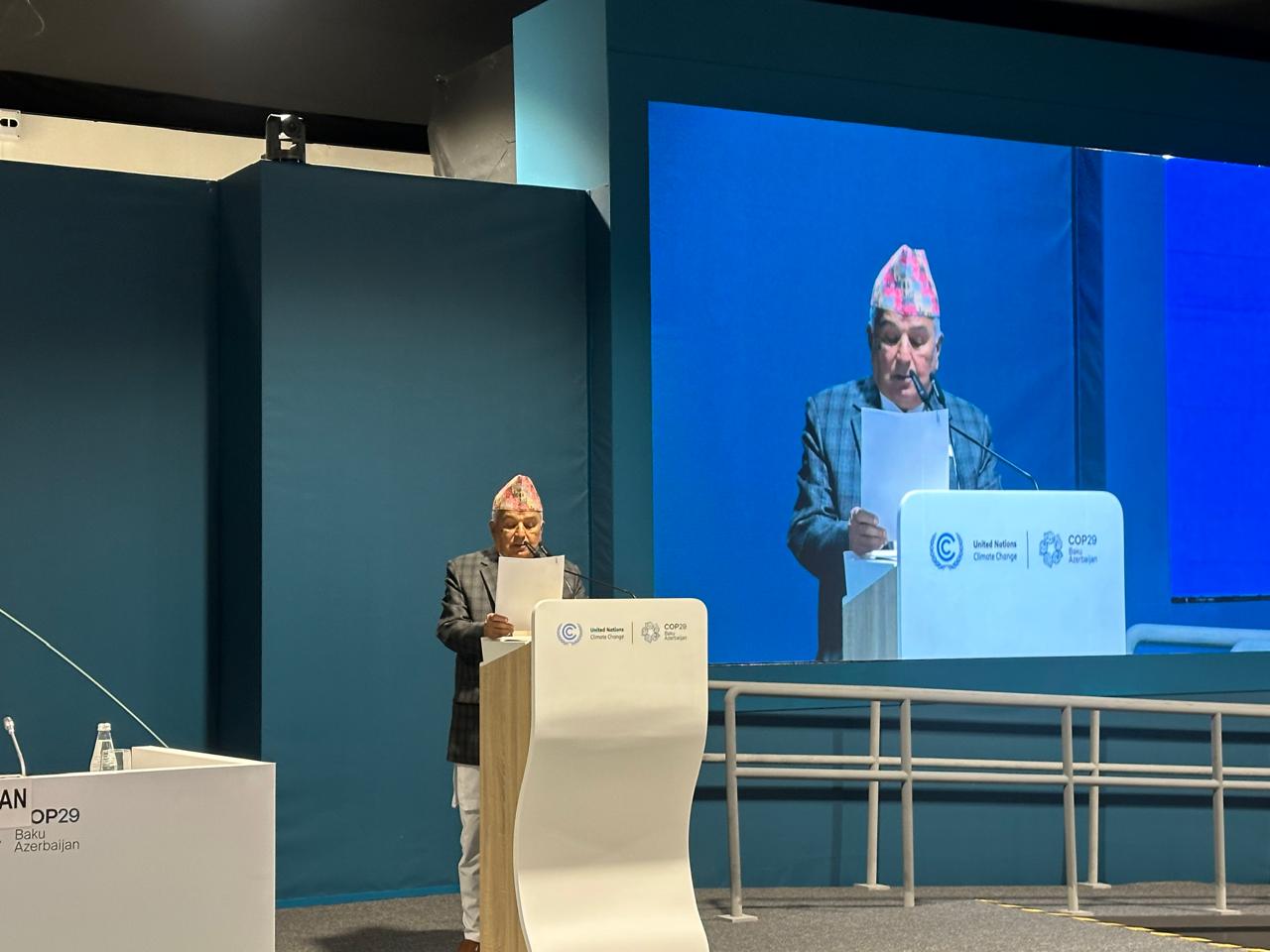 राष्ट्रपति रामचन्द्र पौडेलले जलवायु परिवर्तनका कारण पीडित हुनेहरुलाई न्याय दिने हो भने उनीहरुले भोगेका जलवायु समस्या र गरिवी निवारण कार्यक्रमलाई एकिकृत रुपमा सम्बोधन गर्नुपर्ने बताएका छन् ।अजरबैजानको बाकुमा सोमबारदेखि शुरु भएको कोप २९ सम्मेलनका क्रममा बुधबार किर्गिस्तानद्वारा आज आयोजित उच्चस्तरीय सत्रलाई सम्बोधन गर्दै राष्ट्रपति पौडेलले सो धारणा व्यक्त गरेका हुन् ।‘जलवायु परिवर्तनका कारण पर्वतीय क्षेत्रका युवा विदेश पलायन हुँदा त्यस क्षेत्रका गरिव महिला, बच्चाबच्ची र वृद्धवृद्धा अझ बढी जलवायु प्रभावमा परेका छन्, उनीहरुलाई न्याय दिने हो भने उनीहरुले भोगेका जलवायु समस्या र गरिवी निवारण कार्यक्रमलाई एकीकृत रुपमा सम्वोधन गर्नुपर्ने हुन्छ’, राष्ट्रपति पौडेलले भने ।पर्वतीय क्षेत्रका नागरिकले व्यहोरेका जलवायु समस्या उनीहरुको आफ्नै कारणले नभई त्यो त द्रुत गतिमा प्राकृतिक स्रोतको दोहन गरेर धनी भएका विकसित राष्ट्रहरुले गरेको कार्वन उत्सर्जनका कारण भएको उनको धारणा थियो । ‘उनीहरुलाई जलवायु न्याय दिनमा कोप २९ सफल हुनेछ भन्ने मेरो पूर्ण विश्वास छ’, राष्ट्रपति पौडेलले भने ।जलवायु परिवर्तनका प्रभाव हरेक वर्ष बढ्दो रहेको र त्यसले नयाँ रेकर्ड कायम गर्दै गएको बताउँदै त्यसका कारण पर्वतीय क्षेत्र तुलानात्मक रुपमा बढी जोखिममा परेको उनको भनाइ थियो ।गत अगस्टमा नेपालको सगरमाथा क्षेत्रमा हिउँताल फुट्दा थामे गाउँका ३५ भन्दा बढी घरधुरी विस्थापन भई करोडौको हानीनोक्सानी व्यहोर्नु परेको सन्दर्भ उल्लेख गर्दै उनले गत मनसुन सिजनमा आएको वाढी पहिरोमा नेपालका ५०० बढी नागरिकले जीवन गुमाउनु परेको उनले जानकारी दिए ।यसको पीडा अझै सन्चो भएको छैन, आउँदा दिनमा यो समस्या अझ बल्झिने छ र विकराल अवस्था सृजना गर्ने छ भन्ने आंकलन अहिले नै गरेनौं र उपयुक्त सावधानी लिएनौ भने भोलि अझ बढी हानिनोक्सानी व्यहोर्नु पर्ने छ’, राष्ट्रपति पौडेलले भने । उनले नेपाल र किर्गिस्तान दुवै पर्वतीय मुलुक भएकोले हामीहरुले भोगेका जलवायु परिवर्तनका असर र प्रभाव पनि समान भएको बताए । साथै, नेपाल र किर्गिस्तानले विगतमा हिउँ चितुवा संरक्षणमा पनि सँगै काम गरेको अनुभव रहेको उनले स्मरण गरे । सो कार्यक्रममा किर्जिकिस्तानका राष्ट्रपति, मंगेलियाका राष्ट्रपति, अजरबैजानका विदेशमामिला मन्त्रीलगायतले बोलेका थिए ।अजरबैजानको बाकु सहरमा यही कात्तिक २६ गतेबाट शुरु भएको जलवायु परिवर्तनसम्बन्धी संयुक्त राष्ट्र संघीय संरचना महासन्धि पक्ष राष्ट्रहरुको २९ औँ सम्मेलन (कोप–२९) अन्र्तगत मङगलबार राष्ट्रपति पौडेलले उच्चस्तरीय सत्रको ‘विश्व नेताहरू जलवायु कार्य शिखर सम्मेलन’लाई सम्बोधन गर