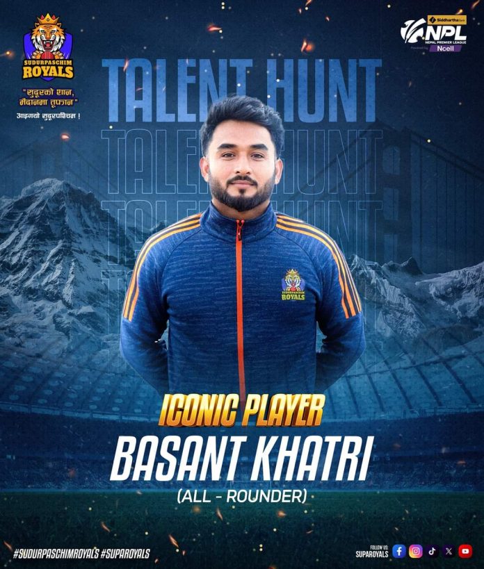 नेपाल प्रिमियर लिगको लागि फ्रेन्चाइज टोली सुदूरपश्चिम रोयल्सले ट्यालेन्ट हन्टबाट आइकोनिक खेलाडीमा अलराउन्डर वसन्त खत्रीलाई छनोट गरेको छ ।धनगढी क्रिकेट एकेडेमीको मैदानमा आइतबार संचालन भएको ट्यालेन्ट हन्टबाट वसन्त आइकोनिक खेलाडीको भूमिकामा टोलीमा समावेश भएका हुन् । उनी अब एनपिएल खेल्ने सुदूरपश्चिम रोयल्सको अधिकारिक टोलीमा हुनेछन् ।