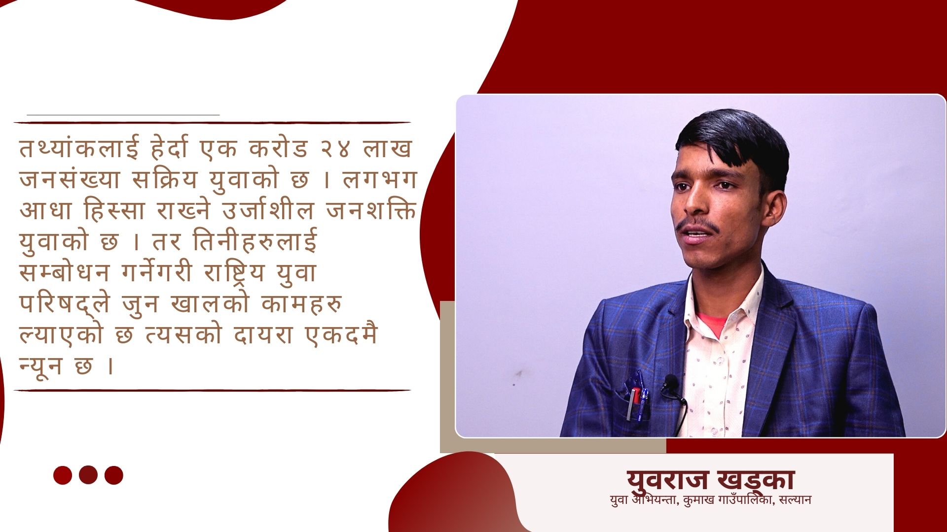 तथ्यांकलाई हेर्दा एक करोड २४ लाख जनसंख्या सक्रिय युवाको छ । लगभग आधा हिस्सा राख्ने उर्जाशील जनशक्ति युवाको छ । तर तिनीहरुलाई सम्बोधन गर्नेगरी राष्ट्रिय युवा परिषद्ले जुन खालको कामहरु ल्याएको छ त्यसको दायरा एकदमै न्यून छ ।