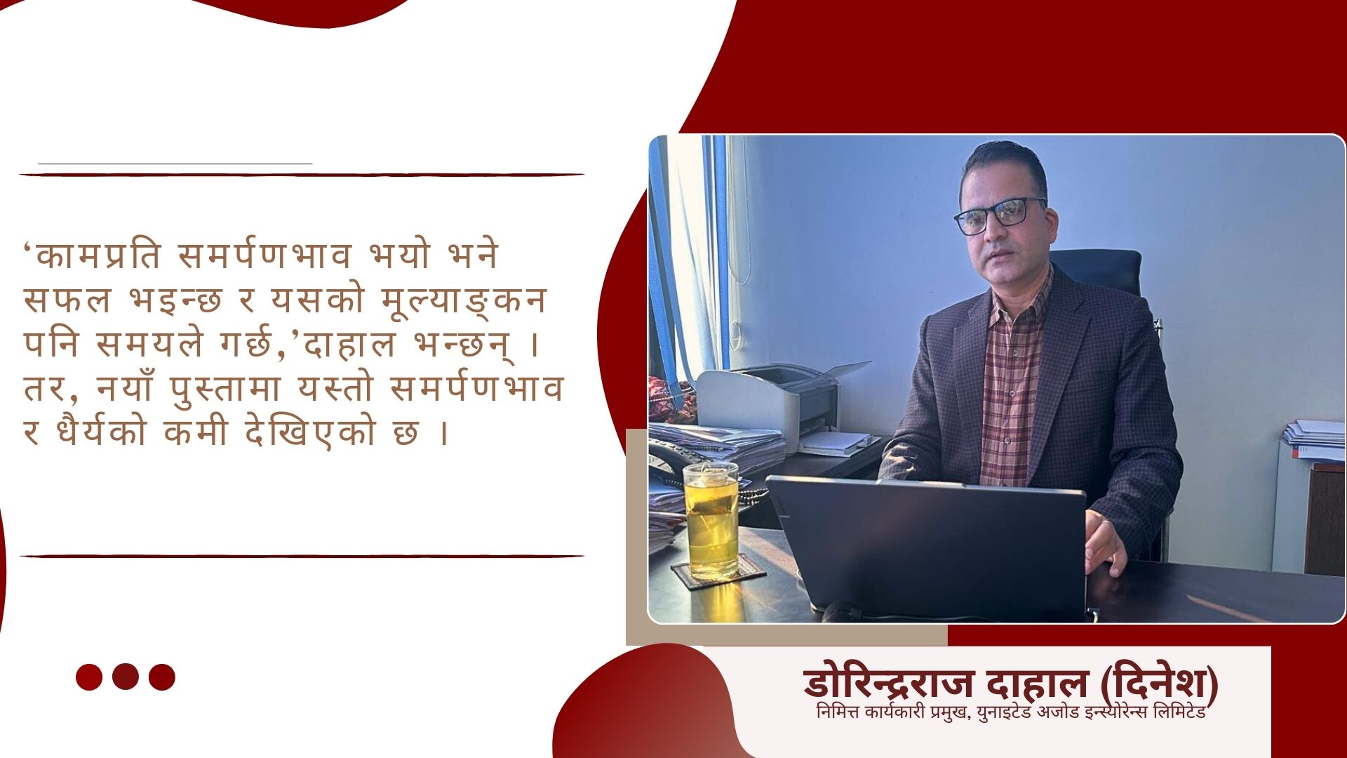 काठमाडौं । कामप्रति समर्पणभाव, अथक मेहनत र लगनशीलताको परिणाम सधैं उज्यालो हुन्छ । यस्तै एउटा प्रेरणादायी नाम हो–युनाइटेड अजोड इन्स्योरेन्सका निमित्त कार्यकारी प्रमुख डोरिन्द्रराज दाहाल (दिनेश) ।