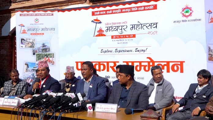 भक्तपुर । मध्यपुर थिमि नगरपालिकाले यही पुष १२, १३ र १४ गते ‘मध्यपुर महोत्सव–२०८१’ आयोजना गर्न लागेका छन् ।विहीबार पत्रकार सम्मेलनको आयोजना गर्दै पर्यटनलाई स्थानीय विकासको साझेदार बनाउनु पर्दछ र स्थानीय सम्पदालाई रोजगारी एवम् आयसँग जोडेर अर्थतन्त्रस गतिशिल एवम् प्रगतिशिल बनाउन सकिन्छ भन्ने अवधारणामा ‘मध्यपुर महोत्सव–२०८१’ को आयोजना गर्न लागेका जानकारी दिएका हुन् ।मध्यपुरलाई पर्यटकीय गन्तव्यको रूपमा विकास गर्न पहिलो पटक बि.स २०५५ सालमा मध्यपुर महोत्सव, २०५८ र २०६१ मा थिमि महोत्सव आयोजना गरिएको थियो ।यस्तै, नगर प्रमुख एवम् संयोजकसुरेन्द्र श्रेष्ठले महोत्सवको मूल उद्देश्य मध्यपुरलाई नयाँ पर्यटकीय गन्तव्यको रुपमा विकास गरी दीर्घकालिन रूपमा नगर र नगरबासीको आर्थिक समृद्धिमा टेवा पु¥याउनु, नगरको स्थानीय कला, संस्कृति र सम्पदाको प्रदर्शन गर्ने, स्थानीय मौलिक पेशा, परिकार र उत्पादनको प्रवर्द्धन गर्ने र समय समयमा हुने ऐतिहासिक जात्रा पर्वहरूको विषयमा जानकारी गराई सो समयमा पर्यटकको आगमन गराउने रहेको बताएका छन् ।महोत्सव थिमि शंखधरचोकबाट शुरु भइ बालकुमारी, चपाचो, नगदेश र बोदे हुदै तिगनिको नीलबाराही स्थानसम्मका ऐतिहासिक वस्तीक्षेत्रमा सञ्चालन हुनेछ ।महोत्सवमा नगरका विभिन्न स्थानमा करिव ४ सय स्टल रहने निश्चित भएको छ । क्षेत्रगत समितिहरुले संकलन गरी महोत्सव सञ्चालक समितिले अनुमोदन गरेको विवरण अनुसार स्थानीय मौलिक कला संस्कृतिका अन्तर्गत २५ वटा विभिन्न नाचहरु प्रदर्शन हुनेछ । सांस्कृतिक बाजागाजा तर्फ २६ प्रदर्शनी हुनेछ भने नेपाली मुद्रा एवम् सिक्काहरुको प्रदर्शनी बालकुमारी र नगदेशमा हुने व्यवस्था गरिएको छ ।नेवारी संस्कार र भेषभुषा प्रदर्शनी ५, शैक्षिक प्रदर्शनी एक, विभिन्न प्रदर्शनी ४, माटोका भाँडाकुडा र सेरामिक्स प्रदर्शनी १६, मूर्ति र मूर्तिकला प्रदर्शनी ४, बाजागाजासहित क्षेत्रगत परिक्रमा एक, खानाका स्टल ५०, पुस्तक प्रदर्शनी ४ र परम्परागत खेल प्रदर्शनी २, दाफा भजन र अन्य भजनकिर्तन प्रदर्शनी ४५ स्थानमा रहनेछ ।घरेलु तथा साना उद्योगका उत्पादन र हस्तकलाका उत्पादनहरुको बालकुमारी र चापाचो गरी दुई स्थानमा हुने प्रदर्शनीमा १२० स्टल रहने छ । ऐतिहासिक जात्रा पर्व र नाचको डेमो प्रदर्शनी ७ स्थानमा रहने छ ।ऐतिहासिक प्याखँ तथा नाचतर्फ अष्टमातृका नाच, इंन्दअप्सरा नाच, जोगी प्याखँ, दिगंवर प्याखँ, द्योवंवीर प्याखँ, नागचा नाच, पुलुकिसि नाच, भष्मासुर, मयुर नाच, महाकाली नाच, राजकुमार नाच, लाखे नाच, लुसी प्याखँ, वा ःपिज्या नाच, सलचा नाच प्रदर्शनीको व्यवस्था गरिएको छ ।सांस्कृतिक बाजागाजा प्रदर्शनीतर्फ गुँला बाजा, घिन्ताङ्गघिसिं, धिमे बाजा, नाय