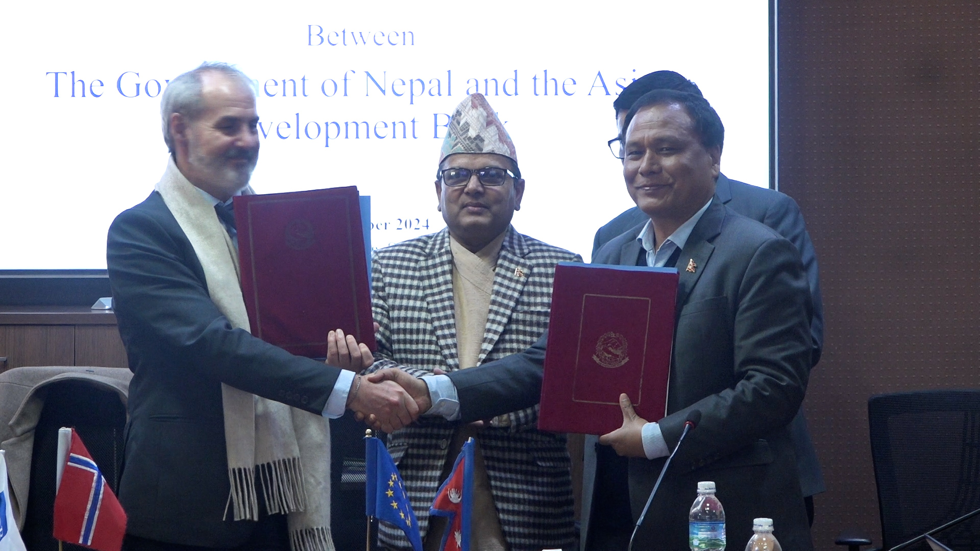 नेपाल सरकार र एसियाली विकास बैंक (एडिबी) बीच तीनवटा आयोजना र एउटा कार्यक्रम कार्यान्वयनका लागि सम्झौता भएको छ ।शुक्रबार नेपाल सरकार र एसियाली विकास बैंकबीच ७७ करोड ७६ लाख अमेरिकी डलर (रु १०५ अर्ब ५९ करोड) बराबरको ऋण तथा अनुदान सम्झौता भएको हो ।काठमाडौं उपत्यका खानेपानी सुधार परियोजना (फेज २), दक्षिण एसिया उपक्षेत्रीय आर्थिक सहयोग (एसएएसईसी) विद्युत प्रसारण तथा वितरण सुदृढीकरण परियोजना र हरित, लचिलो र समावेशी विकास (ग्रिड) कार्यक्रम कार्यान्वयनका लागि वित्तिय सम्झौतामा नेपाल सरकार र एडीबीको तर्फबाट क्रमशः अर्थ मन्त्रालयका अर्थ सचिव डा.रामप्रसाद घिमिरे र नेपाल आवासीय नियोग, एडीबीका देशीय निर्देशक अर्नाउड काउचोइसले हस्ताक्षर गरेका हुन् ।काठमाडौं उपत्यका खानेपानी सुधार परियोजना (चरण २) को आयोजना लागत २४ करोड अमेरिकी डलर (रु. ३२ अर्ब ५९ करोड) एडीबीले १५ मिलियन अमेरिकी डलर (रु. २ अर्ब ३ करोड बराबर) अनुदान र १७ करोड अमेरिकी डलर सहयोग गर्नेछ ।सहुलियत ऋण, समृद्धिका लागि जापान कोष र रिसिलियन्ट एसिया एन्ड प्यासिफिक (जेएफपीआर) ले ३० मिलियन अमेरिकी डलर (रु ४०७.४६ मिलियन बराबर) अनुदान सहयोग गर्नेछ र नेपाल सरकारले यसका लागि ५२ मिलियन अमेरिकी डलर (रु. ७ अर्ब ६ करोड बराबर) सहयोग गर्नेछ ।आयोजनाले काठमाडौं उपत्यकाका जनतालाई सुरक्षित र भरपर्दो खानेपानी सेवा उपलब्ध गराउने लक्ष्य राखेको छ । मेलम्चीको इन्टेकको स्थानान्तरण र निर्माण, लामो सुरुङ निर्माण र सुन्दरीजल जल प्रशोधन केन्द्रको विस्तारलाई यसमा समावेश गरिएको छैन ।दक्षिण एसिया उपक्षेत्रीय आर्थिक सहयोग (सासेक) विद्युत् प्रसारण तथा वितरण सुदृढीकरण आयोजनाको लागत ५३ करोड ७२ लाख अमेरिकी डलर (रु. ७२ अर्ब ९३ करोड), एडीबीले ३ करोड अमेरिकी डलर (रु ४ अर्ब ७ करोड बराबर) अनुदान र ३११ अमेरिकी डलर सहयोग गर्नेछ । मिलियन (रु. ४२ अर्ब २४ करोड बराबर) सहुलियतपूर्ण ऋण, युरोपेली संघले २२.६ मिलियन अमेरिकी डलर (रु. ३ अर्ब ६ करोड) अनुदान, नर्वेले ३१ मिलियन अमेरिकी डलर (रु. ४ अर्ब २१ करोड) अनुदान, रणनीतिक जलवायु कोषले एक करोड अमेरिकी डलर (१ अर्ब ३५ करोड रुपैयाँ बराबर) र सरकारले सहयोग गर्नेछ ।परियोजनाले हरित बिजुली निर्यातलाई समर्थन गर्दै नेपालको बढ्दो ऊर्जा मागहरू पूरा गर्नमा केन्द्रित रहने छ । २९० किलोमिटर प्रसारण लाइन निर्माण, पाँचवटा नयाँ सबस्टेसन र हाल रहेका दुई वटाको स्तरोन्नति आयोजनाका मुख्य अंग हुन् ।एडीबीले बजेट सहयोगको रूपमा हरित, लचिलो र समावेशी विकास (ग्रिड) कार्यक्रमका लागि अमेरिकी डलर १०० मिलियन बराबर सहयोग गर्नेछ ।कार्यक्रमले विभिन्न क्षेत्रहरूमा दिगो लगानीका अवसरहरू अनलक गर्न नीति, नियामक, र संस्थागत अवरोधहरूलाई सम्बोधन गर्द