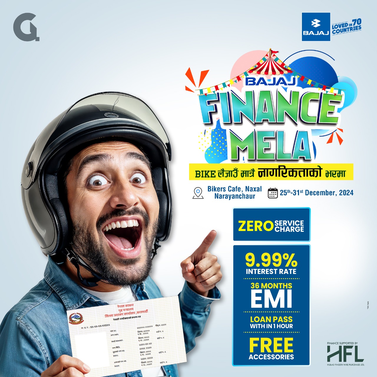 बजाज मोटरसाइकलको नेपालका लागि आधिकारिक बिक्रेता हंसराज हुलासचन्द एण्ड कम्पनी प्रालिले पुष १० गतेदेखि १६ गतेसम्म नक्सालस्थित बाइकर्स क्याफेमा विशेष फाइनान्स मेला २०२४ आयोजना गर्न लागेको छ ।