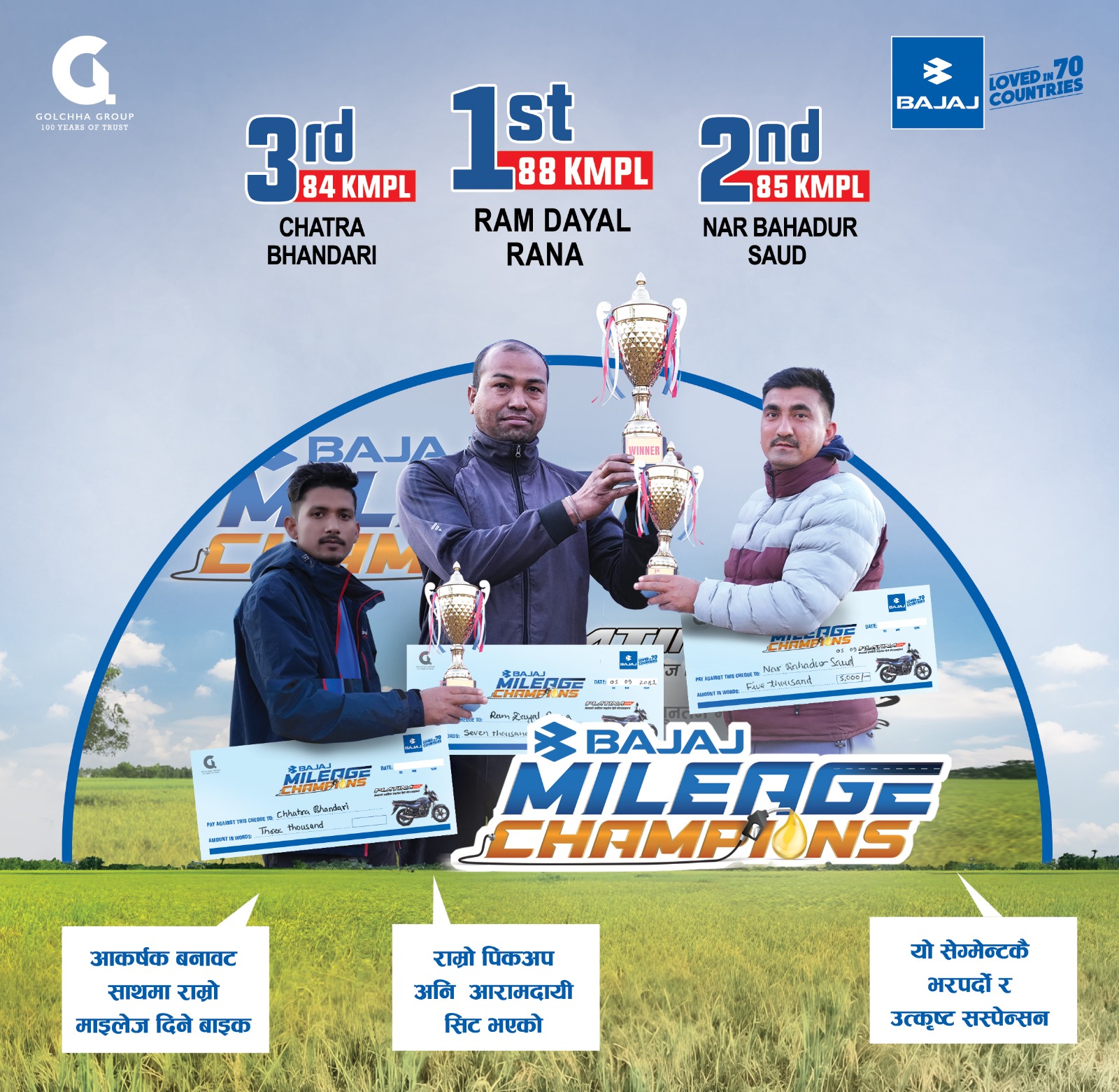 कैलाली । कैलालीको धनगढीमा ‘बजाज माइलेज च्याम्पियन’ सम्पन्न भएको छ ।आफ्नो प्लाटिना मोटरसाइकलको उच्चतम माइलेज क्षमता प्रदर्शन गर्न धनगढीका चालकहरू यस बजाज माइलेज च्याम्पियनमा सहभागी भएका थिए ।धनगढीको चटकपुर चोक अन्तर्गत ट्रक व्यवसाय भवनमा शुक्रबार उक्त कार्यक्रम सम्पन्न भएको थियो ।माइलेज च्याम्पियनमा राम दयाल रानाले ८८ किमि प्रति लिटरको प्रभावशाली प्रदर्शन गर्दै पहिलो स्थान हासिल गरेका थिए । त्यस्तै ८५ किमि प्रति लिटरको प्रदर्शनका साथ नरबहादुर साउद दोस्रो स्थानमा रहेका थिए भने ८४ किमि प्रति लिटरको प्रदर्शन गर्दै चत्रा भण्डारी तेस्रो स्थानमा रहेका थिए ।उक्त माइलेज च्याम्पियनमा सहभागी चालकहरूले न्यूनतम लागतमा सबैभन्दा धेरै दूरी तय गर्ने लक्ष्य सहित प्रतिस्पर्धा गरेका थिए । यो कार्यक्रमले बजाज प्लाटिनाको इन्धन बचत र भरपर्दो विशेषताहरूलाई झल्काउनुका साथै बजाजप्रेमीहरूबीच समुदाय र मैत्रीपूर्ण प्रतिस्पर्धाको भावना पनि प्रवद्र्धन गरेको छ । उक्त कार्यक्रममा लगभग १०० जनाले सहभागिता जनाएको कम्पनीले बताएको छ । आम ग्राहकवर्गलाई बजाज प्लेटिनाको माइलेजबारे जानकारी दिन उक्त च्याम्पियन आयोजना गरिएको बजाजका एरिया सेल्स म्यानेजर रविन खत्रीले बताउनुभयो । १०० सीसीको प्लाटिना मोटरसाइकलको माइलेज च्याम्पियन पनि हुने उनले बताएका छन् ।