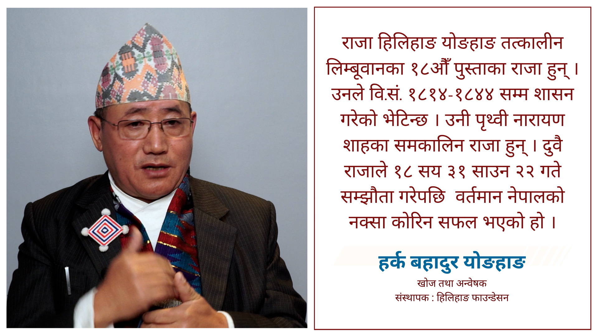 हिमालयको वरीपरि त्यतिबेला किराँत सभ्यता बोकेको इतिहास थियो । नक्सा त्यही किसिमको थियो । अहिले नक्सा खुम्चिएको हो । भारतका कतिपय भाग किराँत राज्य थियो । त्यसको सन्धी सम्झौताबारे लेखकहरुले पनि लेखिसक्नुभएको छ । पाँचवटा वुँदामा सम्झौता भएको छ । परस्पर दाजुभाइको नाता कायम हुनेगरी सम्झौता भएको छ । अहिले विभिन्न लोकसेवाका कितावहरुमा पनि पढ्न पाइन्छ । त्यो सम्झौता दाजुभाइको नाताको हेर्दा सबै जातिय हिसाबले अलिकति फरकपन देखिएछ भनेपनि हामी एउटै हौं भन्ने सन्देश हो । किनकी पृथ्वीनारायण शाह र हिलिहाङको सम्झौता अनुसार दाजुभाइ हो है भनेर लेखिएको छ । सम्झौता अनुसार छिमेकी मुलुकमा संयुक्त युद्ध लड्ने जस्ता लिखित सम्झौता थिए ।
