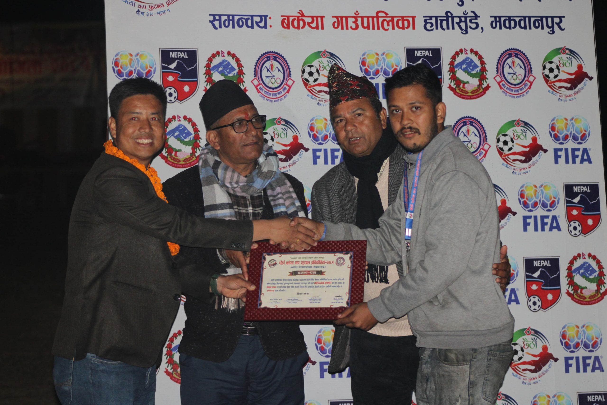 हेटौंडा । मकवानपुरको बकैया गाउँपालिका खेलकुद विकास समितिले छैटौँ संस्करणको बकैया कप फुटबल प्रतियोगिताको समापन समारोहमा खेल पत्रकार दिक्षान्स खड्कालाई सम्मान गरेको छ । उनलाई मंगलबार सम्पन्न पाँचौँ संस्करणको बकैया कप फुटबल प्रतियोगिताको समापन समारोह नगद ५ हजार रुपैयाँसहित सम्मान गरिएको हो । संचारकर्मी खड्काले हेटौंडामा रहेर बकैया क्षेत्रको हरेक खेलकुद गतिविधिलाई खेलाडी तथा जनमानसमा सम्प्रेषण गरेको भन्दै सम्मान गरिएको बकैया गाउँपालिकाका खेलकुद विकास समितिका अध्यक्ष विजय लामा थिङले बताए । खड्कालाई बकैया गाउँपालिका अध्यक्ष धर्मराज लामिछाने लगायतले सम्मानपत्र हस्तान्तरण गरेका हुन् । खड्काले मकवानपुरको खेल क्षेत्रको समाचार सम्प्रेषण गर्ने गरेका छन् ।