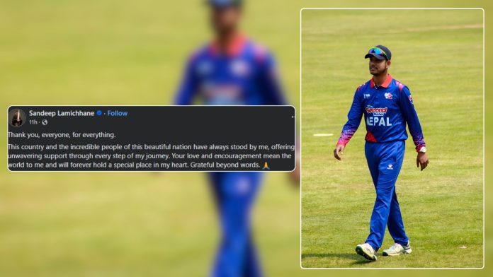 नेपाली किक्रेटर सन्दीप लामिछानेको फेसबुक पोष्टले यतिवेला आम खेलप्रेमीबीचमा कौतुहलता ल्याएको छ । मध्यराति आफ्नो आधिकारिक फेसबुक पेजमा एक पोस्ट लेख्दै उनले सबैप्रति धन्यवाद व्यक्त गरेका छन् । लामिछानेले गएराति सामाजिक सञ्जालमा भावुक स्टाटस लेखेका छन् । नेपाली राष्ट्रिय क्रिकेट टोलीका पूर्वकप्तान तथा लेगस्पीनर लामिछानेले गएराति ११ बजे सामाजिक सञ्जालमा गरेको पोस्टले यतिबेला धेरैको ध्यान तानेको छ । लामिछानेले लेखेका छन्, ‘यी सबै कुराको लागि सबैजनालाई धन्यवाद । यो देश र यहाँका क्रिकेट समर्थकहरुले सधैँ मेरो समर्थन गर्दै मेरो यात्रामा निरन्तर साथ दिनुभएको छ । तपाईँहरुको यो माया र हौसला मेरा लागि सबथोक हो । जसले सधैँभरि मेरो हृदयमा विशेष स्थान बनाइरहनेछ ।’ अंग्रेजी भाषामा सामाजिक सञ्जालमा गरिएको पोस्टमा उनले नेपालका आफ्ना समर्थकहरूप्रति कृतज्ञता प्रकट गरेका छन् । कतिपयले यसलाई सन्दीपले खेलबाट सन्यास लिन लागेको अड्कलबाजी पनि लगाएका छन् ।