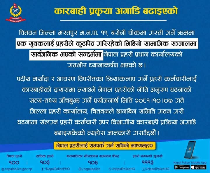 चितवन । चितवनको भरतपुर सडक क्षेत्रमा एक व्यक्तिलाई कुटपिट गर्ने प्रहरी निलम्बनमा परेका छन् । भरतपुर महानगरपालिका–११ बसेनी चोकमा प्रहरीले एक व्यक्तिलाई कुटपिट गरिरहेको भिडियो सार्वजनिक भएपछी प्रहरी सहायक निरीक्षक (असइ) बुद्धिबहादुर घर्ती निलम्बनमा परेका हुन् ।