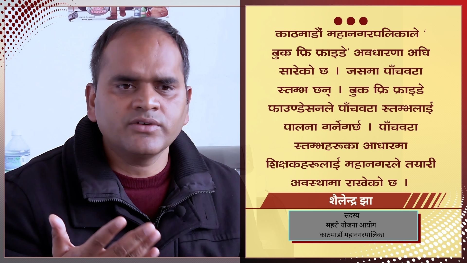 काठमाडौं महानगरपलिकाले ‘बुक फ्रि फ्राइडे’ भन्ने अवधारणा अघि सारेको छ । जसमा पाँचवटा स्तम्भ रहेका छन् । बुक फ्रि फ्राइडे फाउण्डेसनले पाँचवटा स्तम्भलाई सेटप गर्नेगर्छ । पाँचवटा स्तम्भहरुमा शिक्षकलाई महानगरले तयारी अवस्थामा नै राखेको छ । शिक्षकको लागि पूर्ण रुपमा लगानी गर्यौं भने त्यसको उपलब्धि विद्यार्थीहरुमा देखिन्छ । त्यसैले महानगरले विद्यार्थीहरुको लागि इन्गेज गरिरहेको छ । शिक्षकलाई विधिमा मात्र सिमित राख्दा आइटी अथवा कन्टेन डेलिभरीमा पनि शिक्षकहरुलाई इन्गेज गरिरहेका छौँ । यसको लागि शिक्षक–कलेज कार्यक्रम, टिचर कलेज कार्यक्रम पनि गरिरहेका छौँ । यसले शिक्षकलाई निरन्तर अध्ययन गर्ने वातावरण सिर्जना समेत गरिरहेको छ ।