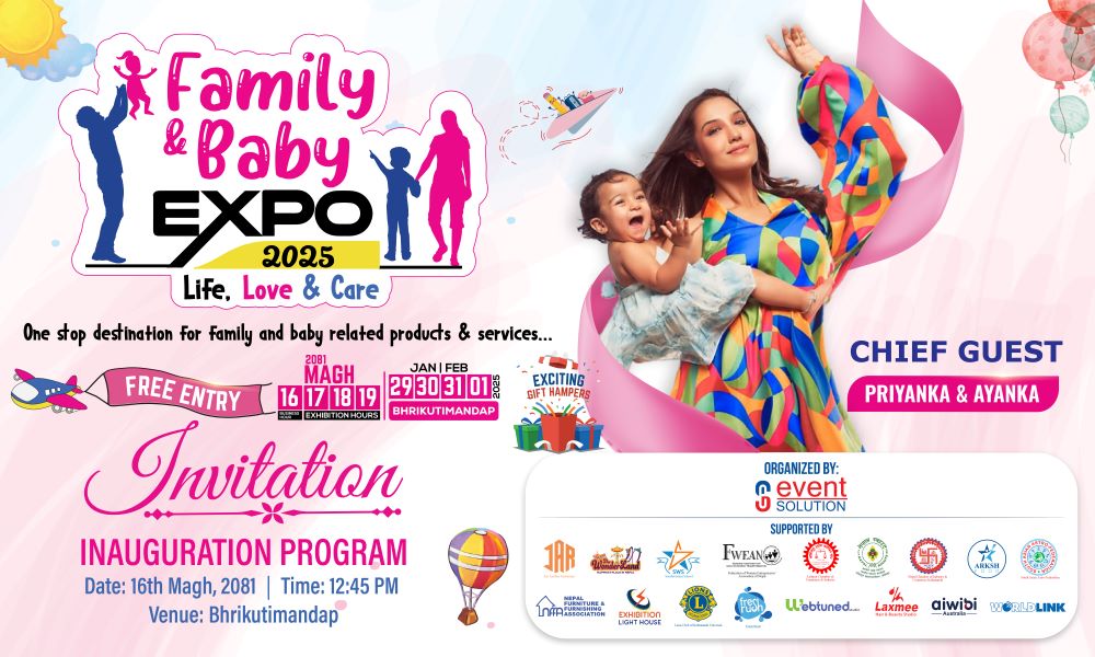 माघ १६ गतेदेखि इभेण्ट सोलुसन प्रालिको आयोजनामा राजधानीको भृकुटीमण्डपमा ‘फेमिली एण्ड बेबी एक्स्पो २०२५’ आयोजना हुन लागेको हो ।