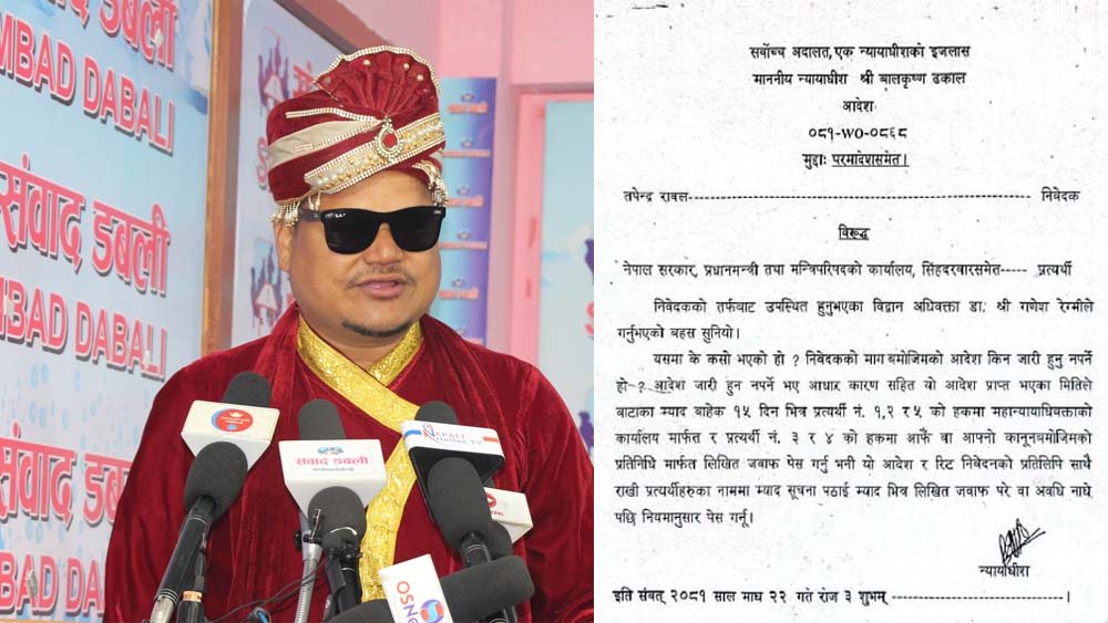 हालै माघ २२ गते न्यायाधीश बालकृष्ण ढकालको एकल इजलाशले नेपाल सरकार, प्रधानमन्त्री तथा मन्त्री परिषदको कार्यालय सिंहदरबार, संस्कृति, पर्याटन तथा नागरिक उड्डयन मन्त्रालय, नेपाल नागरिक उड्डयन प्राधिकरण बबरमहल, नेपाल पर्यटन बोर्ड भृकुटीमण्डप, राष्ट्रिय सूचना आयोगका नाममा १५ दिने कारण देखाउ आदेश जारि गरेको रावलले बताए । अध्यक्ष रावलले अदालत जानु पूर्व नेपाल सरकार, पधानमन्त्री, पर्यटनमन्त्री, प्रदेश सरकारका मुख्यमन्त्री तथा पर्यटनमन्त्री, राजनीतिक दल, पर्यटनसँग सरोकार राख्ने संघसंस्थाका प्रमुख तथा प्रतिनीधी सबैलाई प्रमाणसहित भेट तथा निवेदन गर्दा कसैले नसुनेको आरोपसमेत लगाए ।