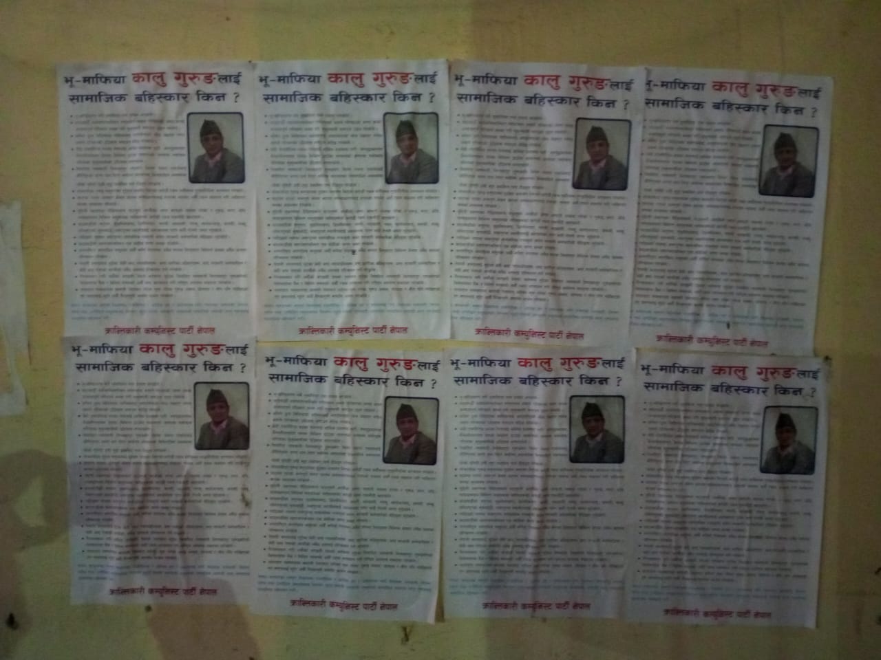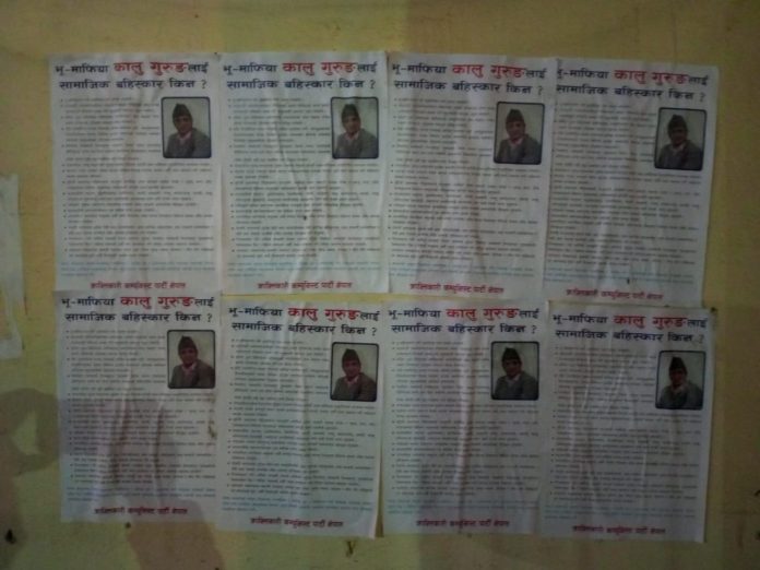 गुरुङले पहुँच र शक्तिको आडमा जनयुद्धकालमा कैलालीलगायत देशका विभिन्न ठाउँमा सामन्तको जग्गामा बसोबास गरिरहेका सुकुम्बासीको उठिबास लगाएको, मीनभवनस्थित गणेश अवाले परिवारको पूर्खौली जग्गा जबरजस्त कब्जा गरी उठिबास लगाउन लागेको, गुरुङ समुदायका सयौं व्यक्तिको करोडौं रकम अपचलन गरेको, नेकपा एमालेलाई जग्गादान गरेर युनिट गठी प्रकरण डिसमिस गर्न खोजेको, विभिन्न ठाउँमा सार्वजनिक तथा व्यक्तिका जग्गा हड्प्ने गरेको, सामन्त तथा भूमाफियाका जग्गामा बसोबास गरिरहेका सुकुम्बासीको उठिबास लगाएको, भूखण्डकरण गर्ने गरेकोलगायतका विभिन्न आरोप पोष्टरमा लगाइएको छ ।