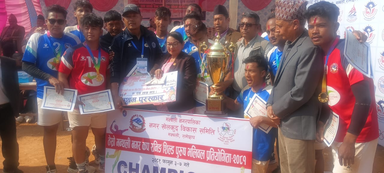 रामेछाप । मन्थली नगरपालिकाको तेस्रो मन्थली नगर कप पुरुष भलिबलको उपाधि मन्थली–८ चिसापानीले जितेको छ ।