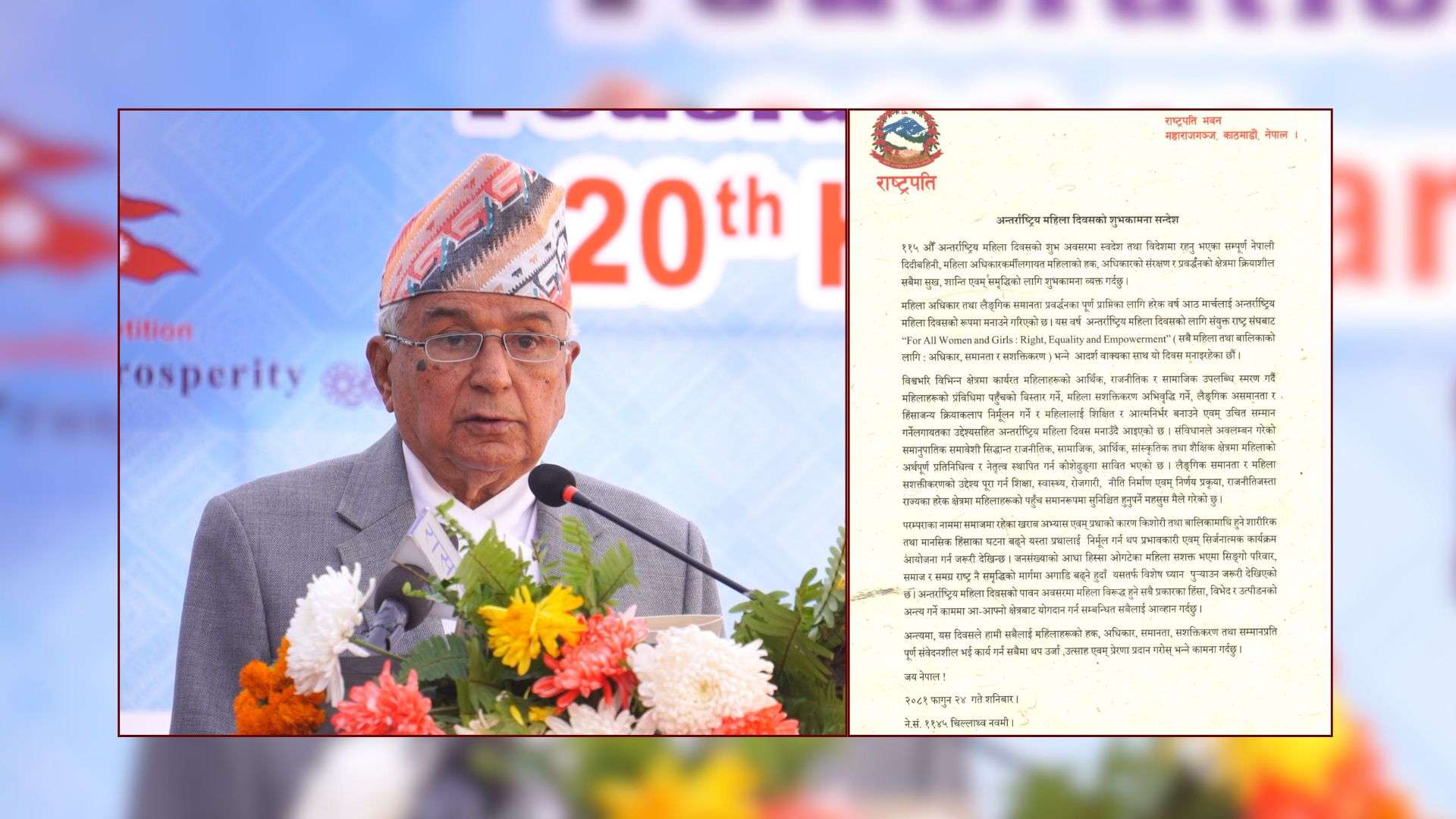 शनिबार ११५ औँ अन्तर्राष्ट्रिय महिला दिवसको अवसरमा शुभकामना व्यक्त गर्दै उनले राज्यका हरेक क्षेत्रमा महिलाहरूको पहुँच समानरूपमा सुनिश्चित हुनुपर्ने भन्दै संविधानले अवलम्बन गरेको समानुपातिक समावेशी सिद्धान्त महिलाको अर्थपूर्ण प्रतिनिधित्व र नेतृत्व स्थापित गर्न कोशेढुङ्गा सावित भएको बताए ।