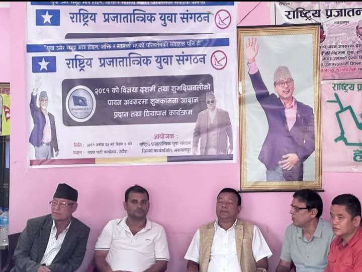 युवा संगठनका जिल्ला संयोजक किशोर खत्रीको अध्यक्षता तथा राप्रपा जिल्ला अध्यक्ष सागर थापाको प्रमुख आतिथ्यतामा आज राप्रपा मकवानपुरको पार्टी कार्यालयको सभाहलमा सम्पन्न भएको हो ।