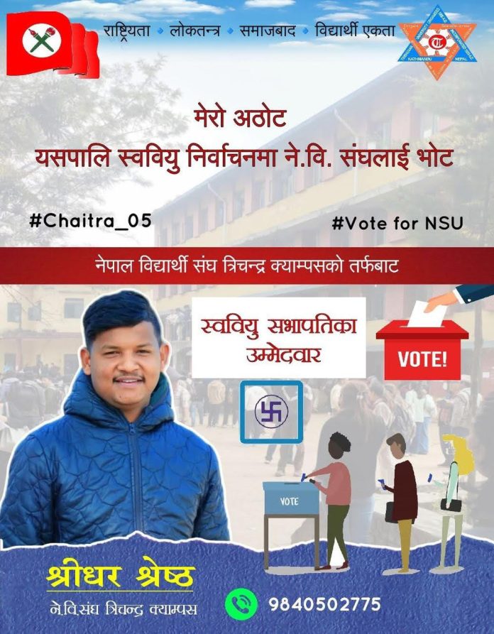 त्रिचन्द्र कलेजको स्वतन्त्र विद्यार्थी युनियन (स्ववियु) को आगामी चुनावमा नेपाल विद्यार्थी संघले आफ्नो आधिकारिक उम्मेद्वारको रूपमा श्रीधर श्रेष्ठलाई सभापतिको टिकट दिएको छ । यस निर्णयले चुनावी मैदानमा नयाँ गतिशीलता ल्याएको छ भने विद्यार्थी राजनीतिमा पनि नयाँ चर्चा सुरु भएको छ ।