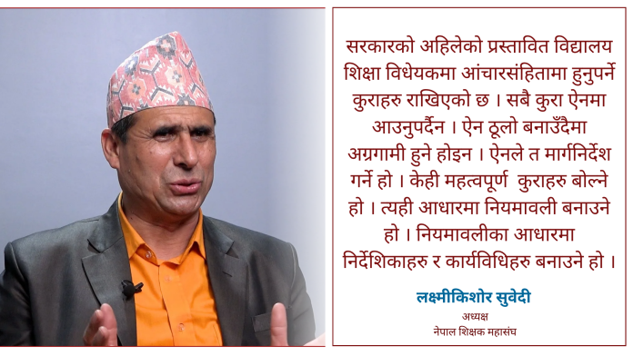 विद्यालय शिक्षा ऐन जारी गर्न माग राख्दै देशभरका शिक्षकहरु यतिबेला आन्दोलनमा छन् । नेपाल शिक्षक महासंघको अगुवाइमा २०८० मा सरकारसँग भएको सहमति अनुसार ऐन जारी गर्नुपर्ने र निवृत्तिभरण अध्यादेश खारेज गर्नुपर्ने माग राख्दै शिक्षकहरुले चरणबद्ध आन्दोलन गरिरहेका छन् । यसै सिलसिलामा महासंघका अध्यक्ष लक्ष्मीकिशोर सुवेदीसँग नेपाल न्यूज बैंकले कुराकानी गरेको छ ।