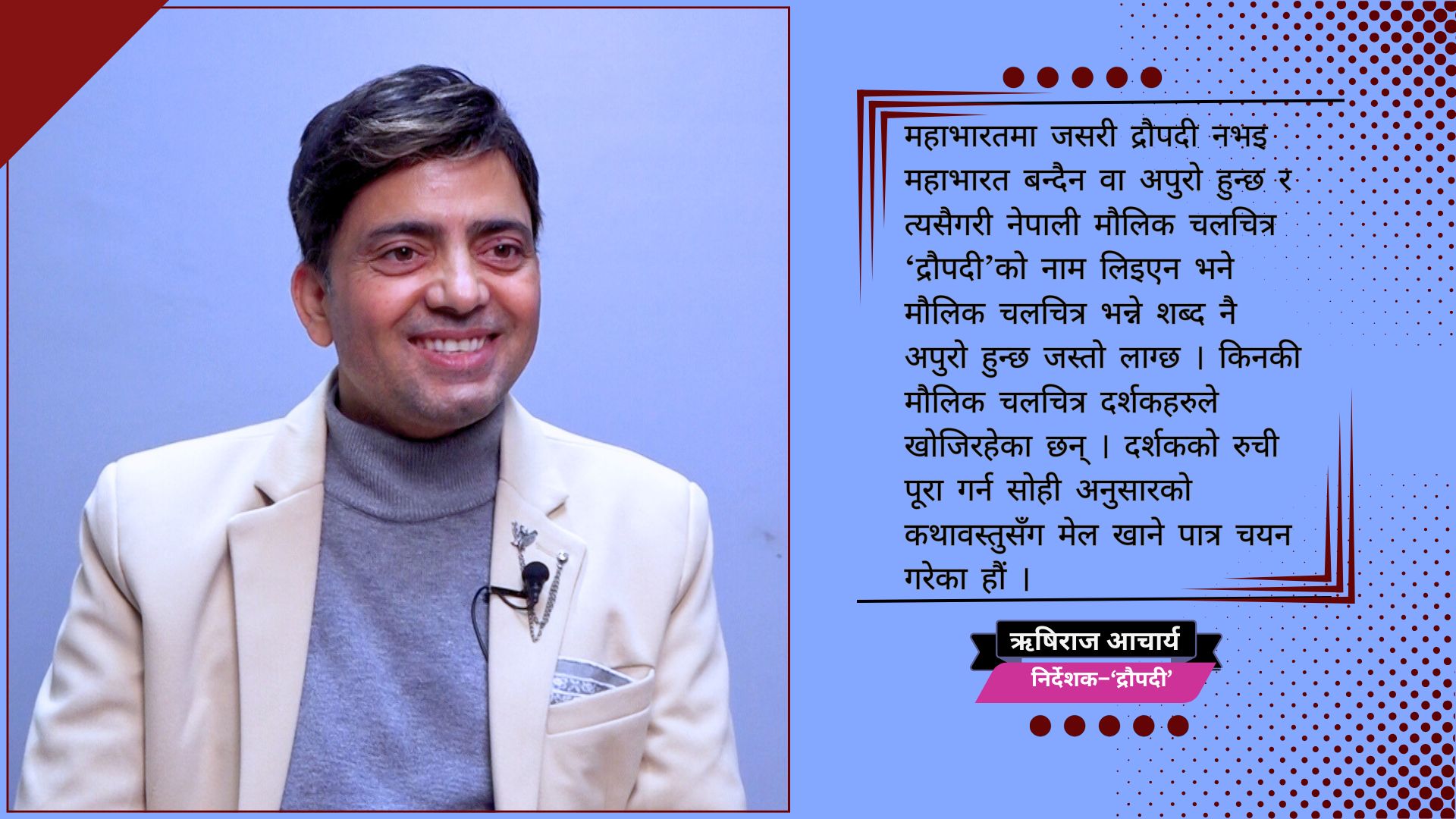 वास्तवमा यतिबेला नेपाली चलचित्रको भविष्य एकदमै राम्रोपनि देखिरहेको छु । कुनै समय यति धेरै पढेर पनि फिल्म क्षेत्रमा किन लाग्या भनेर निरुत्साहित गर्नु भएको थियो । फिल्ममा लाग्न पनि पढ्नुपर्छ भनेर पनि भन्ने गर्नुहुन्थ्यो तर अहिले सोच परिवर्तन हुँदै गएको छ । दर्शकहरुले मेरो टेलीसिरियलहरु जसरी माया गर्नु भएको थियो त्यसरी नै द्रौपदीलाई पनि माया गर्नुहुन्छ भन्ने विश्वास लिएको छु । (चलचित्र ‘द्रौपदी’का निर्देशक ऋषिराज आचार्यसँग नेपाल न्यूज बैंकले गरेको कुराकानीमा आधारित)