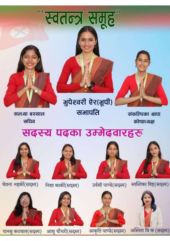 त्यसैगरी सदस्यमा उर्वशी पाण्डे, चेतना नहर्की, अस्मिता वि.क, स्वस्तिका विष्ट, आशु चौधरी, आकृति पाण्डे, निशा कार्की र यनसु कटवाल विजयी भएका हुन् । प्रमुख पद र सदस्यमा निर्वाचित सबै स्वतन्त्र उम्मेदवार हुन् ।