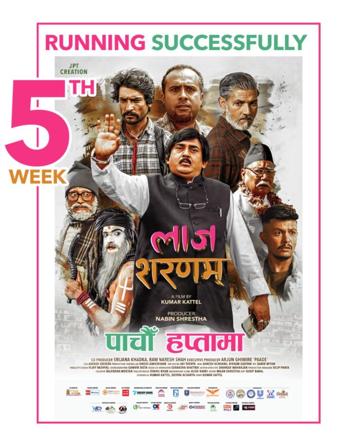चलचित्र ‘लाज शरणम्’ प्रदर्शनको पाँचौँ हप्तामा प्रवेश गरेको छ । शिवरात्रिको अवसर पारेर फागुन १४ गतेबाट रिलिज आएको चलचित्र पाँचौँ हप्तामा प्रवेश गरेको हो ।