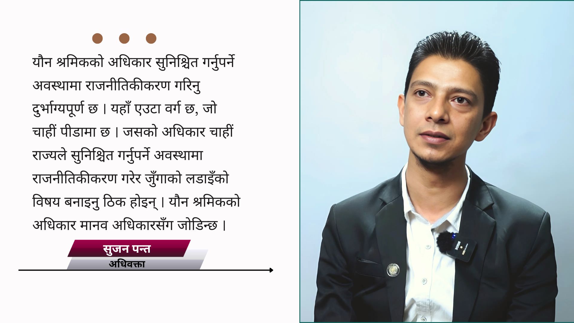 यौनिक तथा लैङ्गिक अल्पसंख्यकहरुका पक्षमा वकालत गर्दै आइरहेका अधिवक्ता सुजन पन्तले यौन श्रमिकको अधिकार सुनिश्चित गर्नुपर्ने अवस्थामा राजनीतिकीकरण गरिनु दुर्भाग्यपूर्ण भएको बताए । ‘यहाँ एउटा वर्ग छ, जो चाहीं पीडामा छ । जसको अधिकार चाहीं राज्यले सुनिश्चित गर्नुपर्ने अवस्थामा यसलाई राजनीतिक गरेर खाने विषय बनाउनु अत्यन्तै दुर्भाग्यपूर्ण छ,’ उनले भने ।