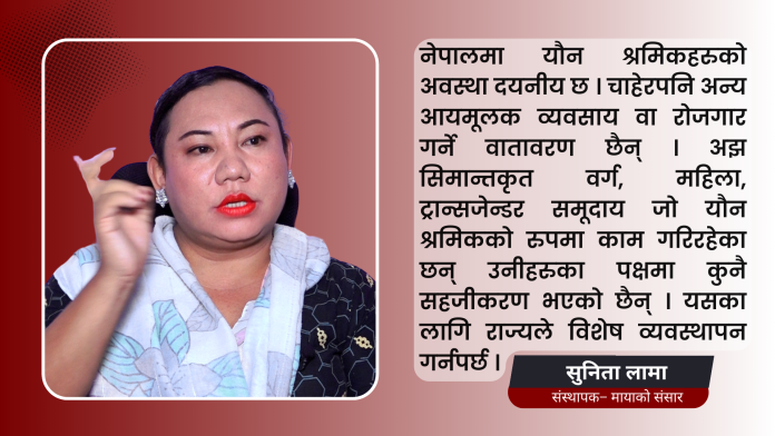 ‘नेपालमा एक लाख यौन श्रमिक छन्, कसले व्यवस्थापन गर्ने ?’यौन श्रमिकहरुको न्यायको लागि काम गर्ने संस्था मायाको संसारकी संस्थापक सुनिता लामाले नेपालमा यौन श्रमिकहरुको अवस्था दयनीय रहेकाले उनीहरुले पनि आफ्नो योग्यता अनुसार बाँच्न पाउनुपर्ने अधिकार रहेको बताएकी छिन् ।