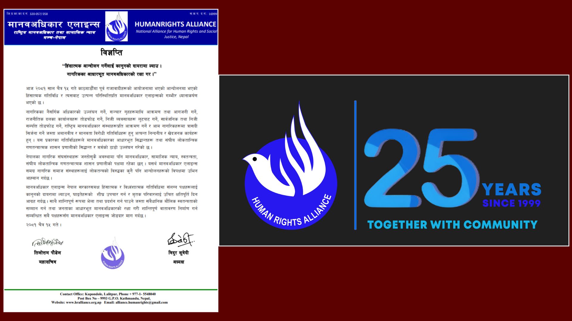 प्रेस विज्ञप्ती जारी गर्दै मानवअधिकार एलाइन्सका अध्यक्ष विदुर सुवेदीले हिजो राजावादीहरूको अमानवीय र मानवता विरोधी गतिविधिहरू अत्यन्त निन्दनीय र खेदजनक कार्य भएको भन्दै हिंसात्मक गतिविधिमा संलग्न पक्षहरूलाई कानुनको दायरामा ल्याउन आग्रह गरेका हुन् ।