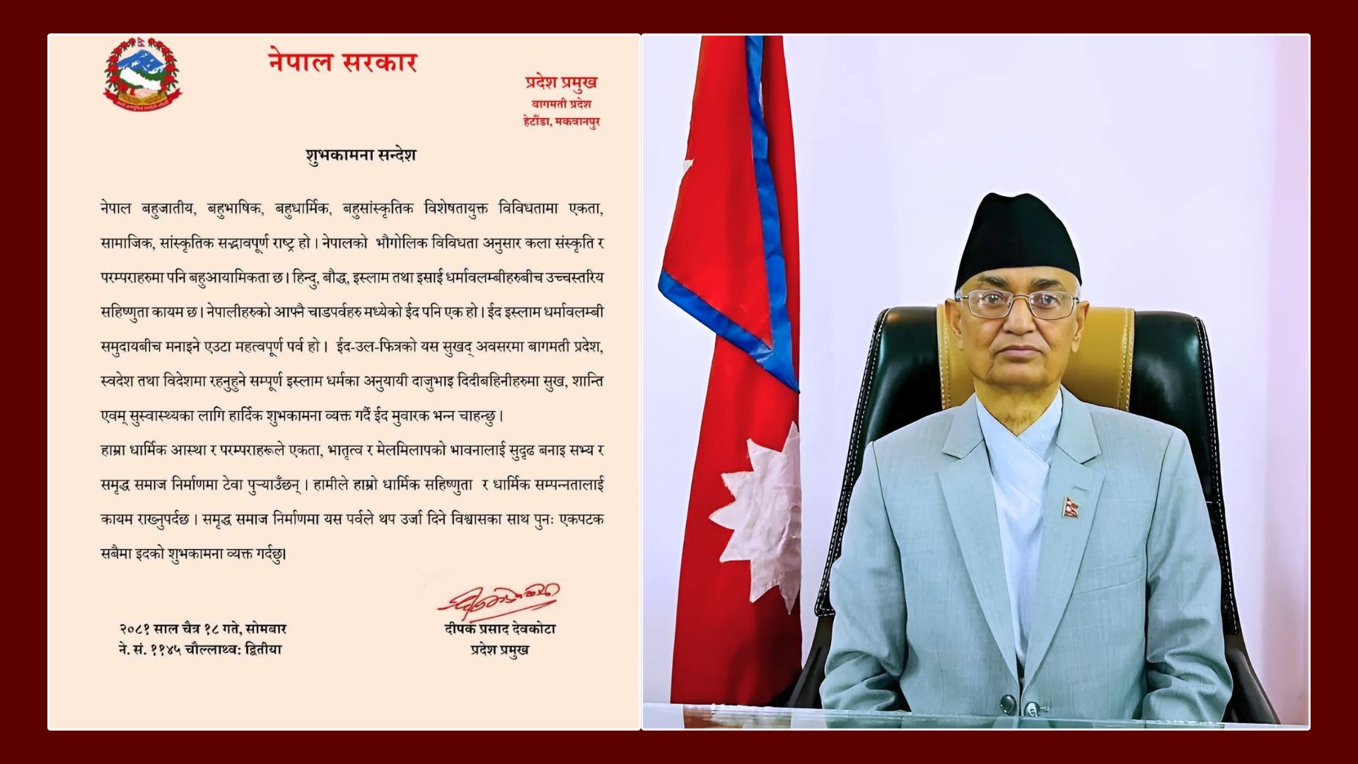 ‘ईद–उल–फित्रको सुखद् अवसरमा बागमती प्रदेश, स्वदेश तथा विदेशमा रहनुहुने सम्पूर्ण इस्लाम धर्मका अनुयायी दाजुभाइ दिदीबहिनीहरुमा सुख, शान्ति एवम् सुस्वास्थ्यका लागि हार्दिक शुभकामना व्यक्त गर्दै ईद मुवारक भन्न चाहन्छु’ उनले सन्देशमा उल्लेख गरेका छन् ।