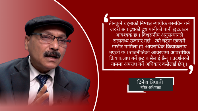 राप्रपाले आफ्ना नेता छुटाउनेतिर होइन्, अनुसन्धानमा सहयोग गर्नपर्छ समसामयिक घट्ना र राजनीतिक उतारचढावका विषयमा तत्काल प्रतिक्रिया जनाउने दिनेश त्रिपाठी चर्चित एवं बरिष्ठ अधिवक्ता हुन् । उनी संवैधानिक कानूनका विज्ञ पनि हुन् । यही चैत्र १५ गते काठमाडौंको तीनकुनेमा राजतन्त्र पुर्नस्थापनाका लागि भन्दै गरिएको आन्दोलन हिंसात्मक भएपछि दर्जनौं प्रदर्शनकारी प्रहरीले पक्राउ गरेको छ । यसै सिलसिलामा पक्राउपछिको कानुनी कारवाही, आन्दोलनको समीक्षा र भावी कार्यदिशाका बारेमा नेपाल न्यूज बैंकले बरिष्ठ अधिवक्ता त्रिपाठीसँग कुराकानी गरेको छ ।