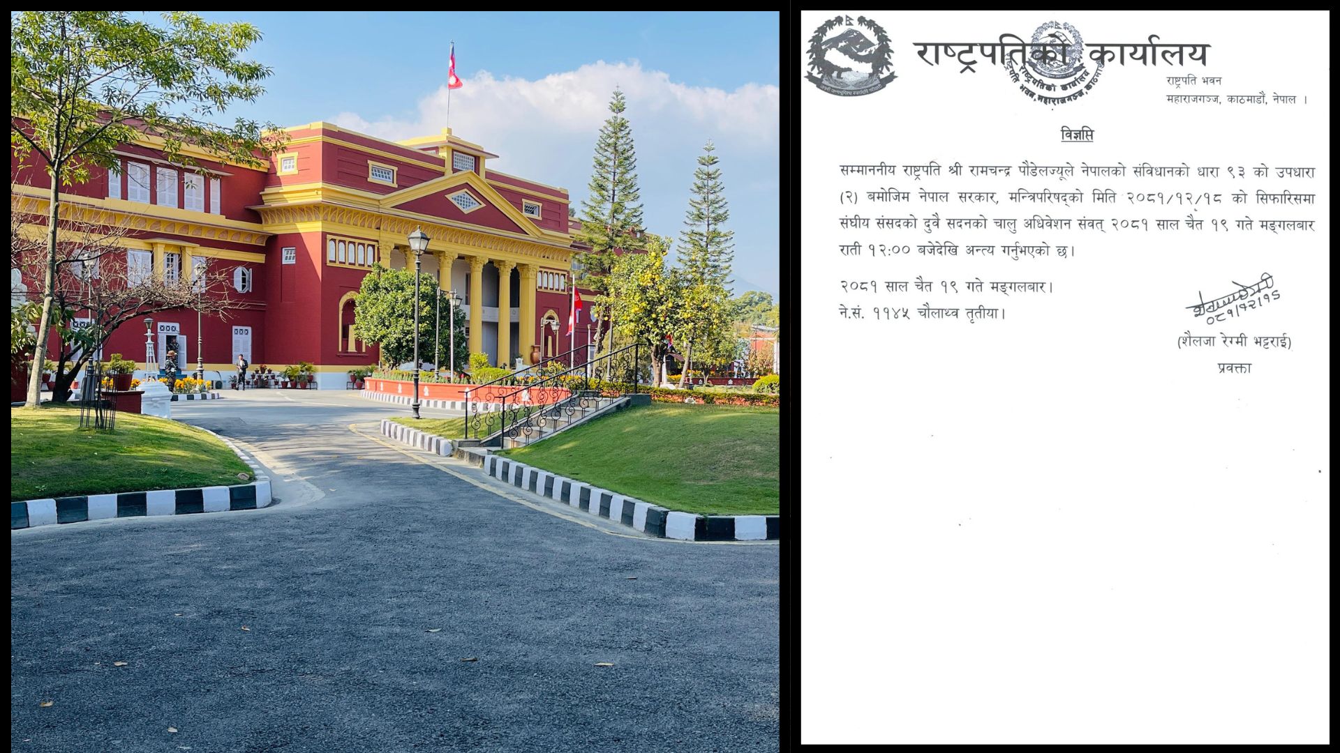 सरकारको सिफारिसमा राष्ट्रपति पौडेलले नेपालको संविधानको धारा ९३ को उपधारा (२) बमोजिम आज (चैत १९ गते) राति १२ बजेदेखि लागु हुने गरी चालु अधिवेशन अन्त्य गरेका हुन् ।