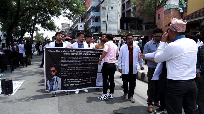 मन्त्रिपरिषद्बाट पारित भएको न्यूनतम तलब नपाएको तथा चिकित्सा शिक्षा आयोगको निर्णय अनुसार प्राइभेट कलेजलाई सेवा सुविधा नदिएको भन्दै डाक्टरहरु विगत केही दिनदेखि धर्नामा रहेका छन् ।
