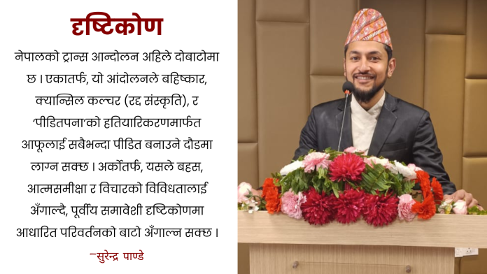 नेपालको ट्रान्स आन्दोलन अहिले दोबाटोमा छ । एकातर्फ, यो आंदोलनले बहिष्कार, क्यान्सिल कल्चर (रद्द संस्कृति), र ‘पीडितपना’को हतियारिकरणमार्फत आफूलाई सबैभन्दा पीडित बनाउने दौडमा लाग्न सक्छ । अर्कोतर्फ, यसले बहस, आत्मसमीक्षा र विचारको विविधतालाई अँगाल्दै, पूर्वीय समावेशी दृष्टिकोणमा आधारित परिवर्तनको बाटो अँगाल्न सक्छ ।