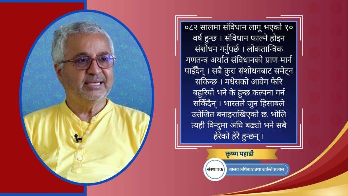 राष्ट्रिय सहमतिको सरकार बने मात्र संविधान संशोधन हुन्छ ः मानव अधिकार तथा शान्ति समाजका संस्थापक सभापति कृष्ण पहाडी लोकतान्त्रिक जनआन्दोलनका अगुवा हुन् । ०६२।०६३ सालको जनआन्दोलनमा नागरिक समाजका तर्फबाट अग्रपंक्तीमा बसेर भूमिका निर्वाह गरेका पहाडी लोकतान्त्रिक गणतन्त्रको संस्थागत विकासमा राजनीतिक दलहरुको भूमिकाको कडा रुपमा आलोचना गर्दै आइरहेका छन् । यसै सिलसिलामा लोकतन्त्र दिवसको अवसर पारेर नेपाल न्यूज बैंकले उनीसँग कुराकानी गरेको छ ।