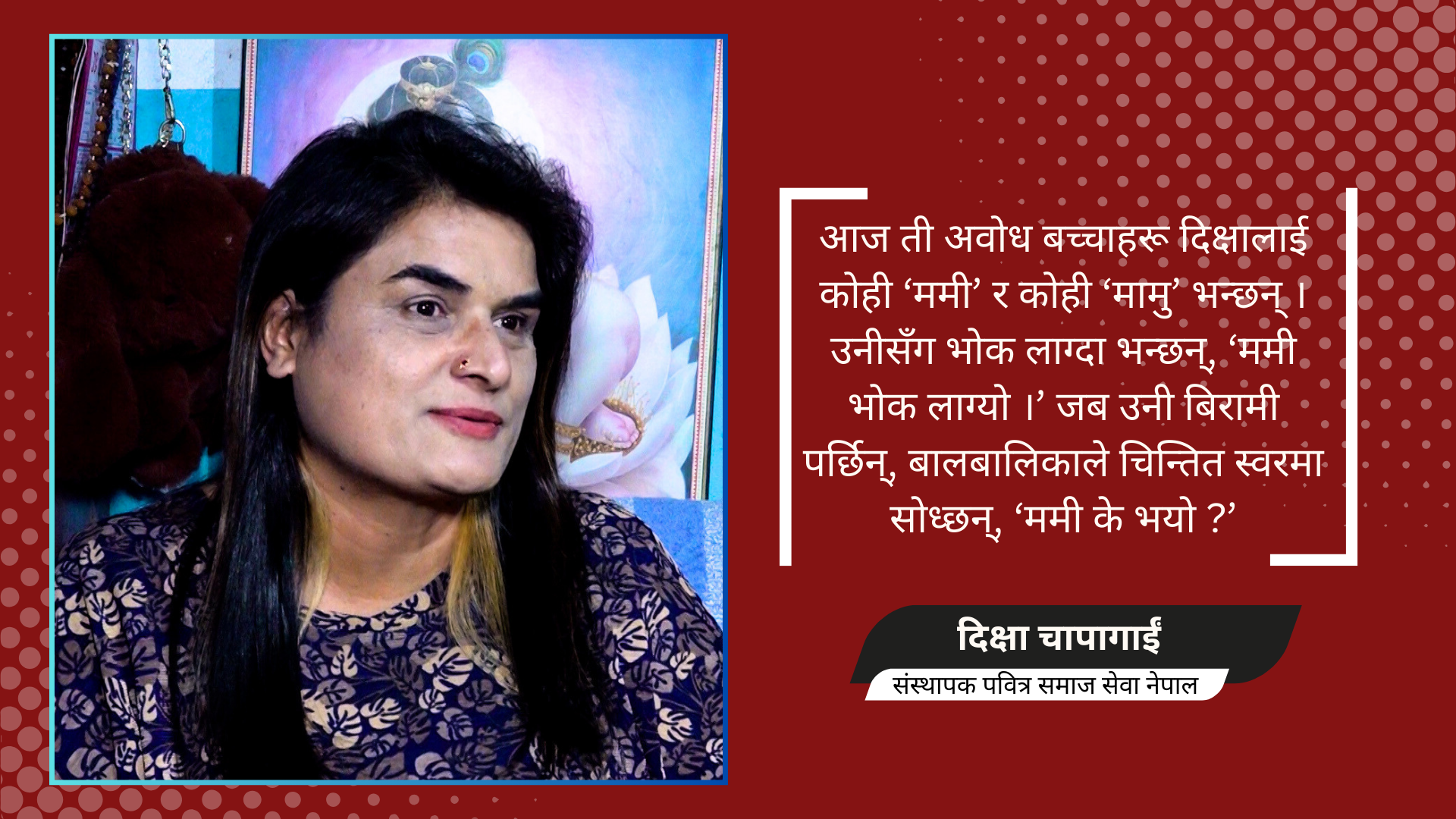 आफ्ना सन्तान जन्माएर भाग्ने, छाडेर जाने, हराउने… यस्ता कैयौं घटनाहरूले दिक्षा चापागाईंको मनलाई झस्क्याउँछ तर कमजोर बनाउँदैन । विगत २३ वर्षदेखि उनले त्यस्ता थुप्रै निर्दोष अनुहारहरूलाई अँगालोमा बाँधिन्–जसको कोही थिएन, तर आज उनीहरूका लागि ‘सबैथोक’ को रूपमा दिक्षा उभिएकी छिन् ।